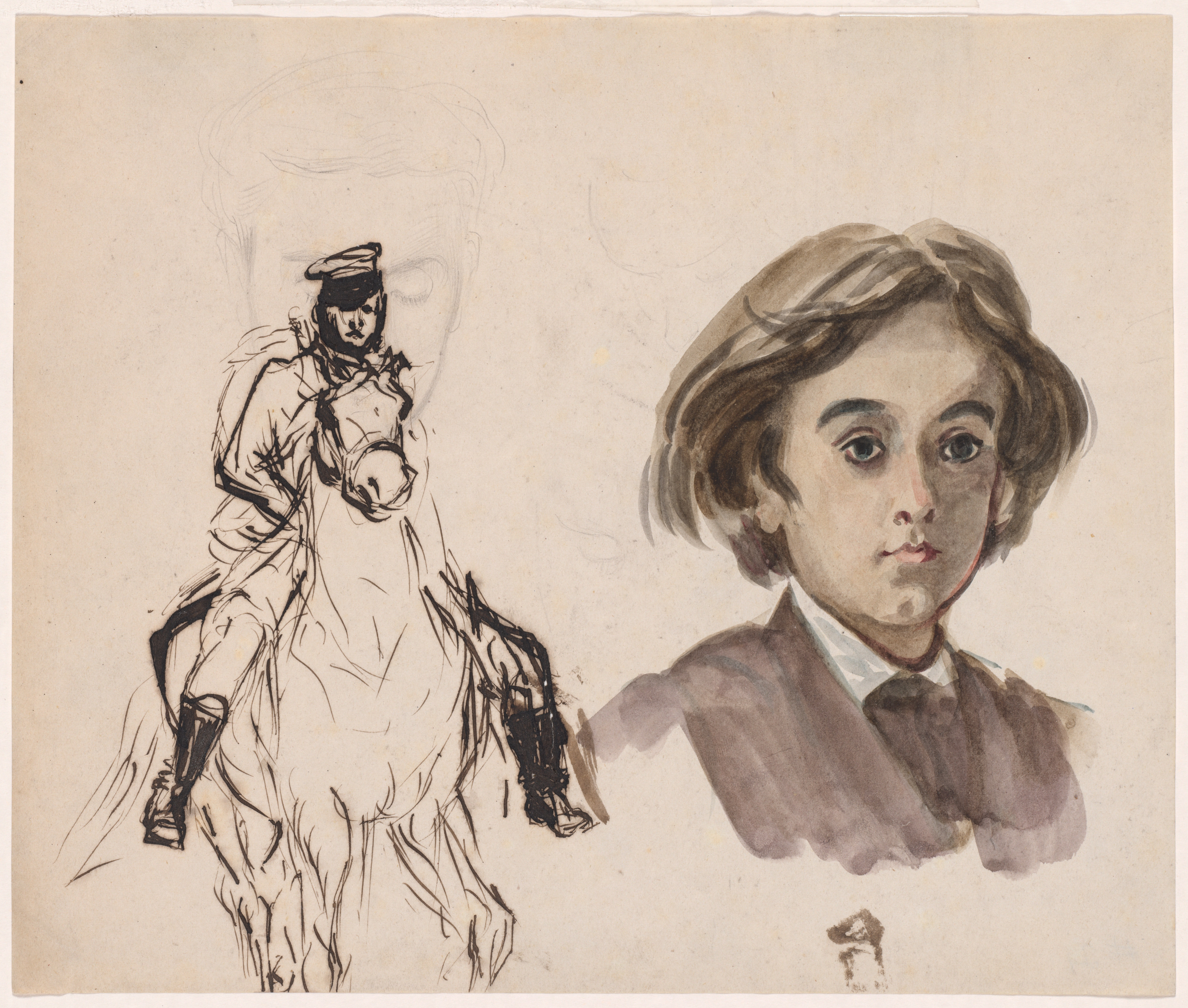 Tan paper with two sketches; on left a sketch of a man riding a horse, man drawn with minimal detail wearing military uniform and cap and holding reins with right hand; on right a detailed watercolor portrait of a young man with shoulder length hair wearing a brown suit jacket and white shirt.