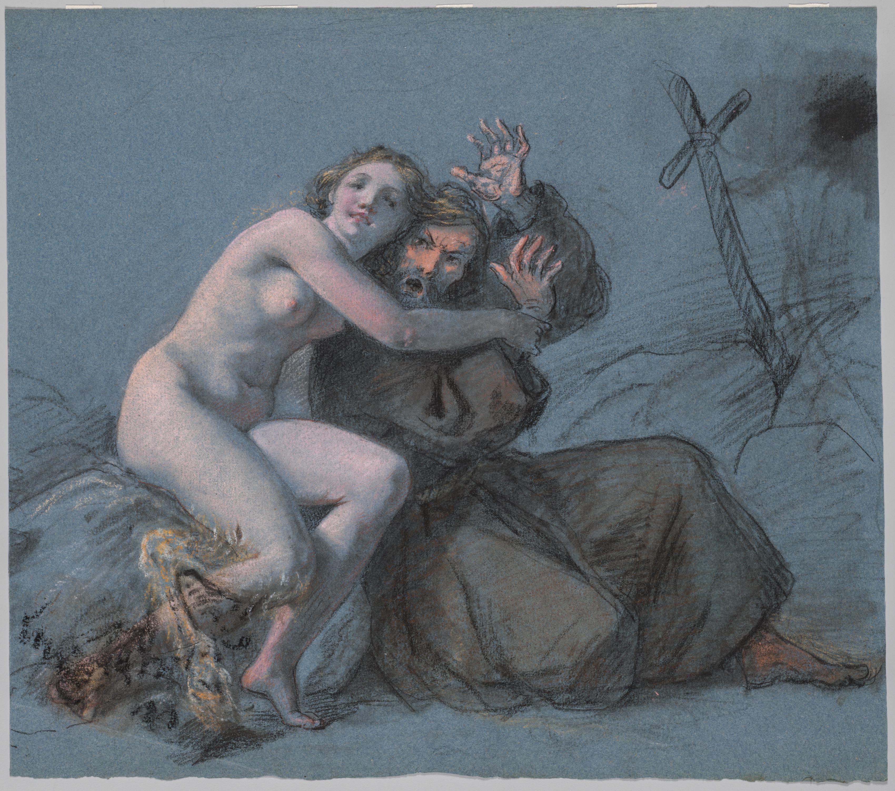 The Temptation of St. Anthony by Julien Léopold Boilly: A drawing of a nude woman with fair skin and light brown hair sitting on top of a man with his hands raised; she embraces him with her right arm as her left hand grasps his hair. The man wears dark clothing with long sleeves and sits on a cloth or animal pelt. He has long dark hair and a beard and appears to have an open mouth. A blue-grey background dominates the scene. A stick or post with an X on top appears on the right side.