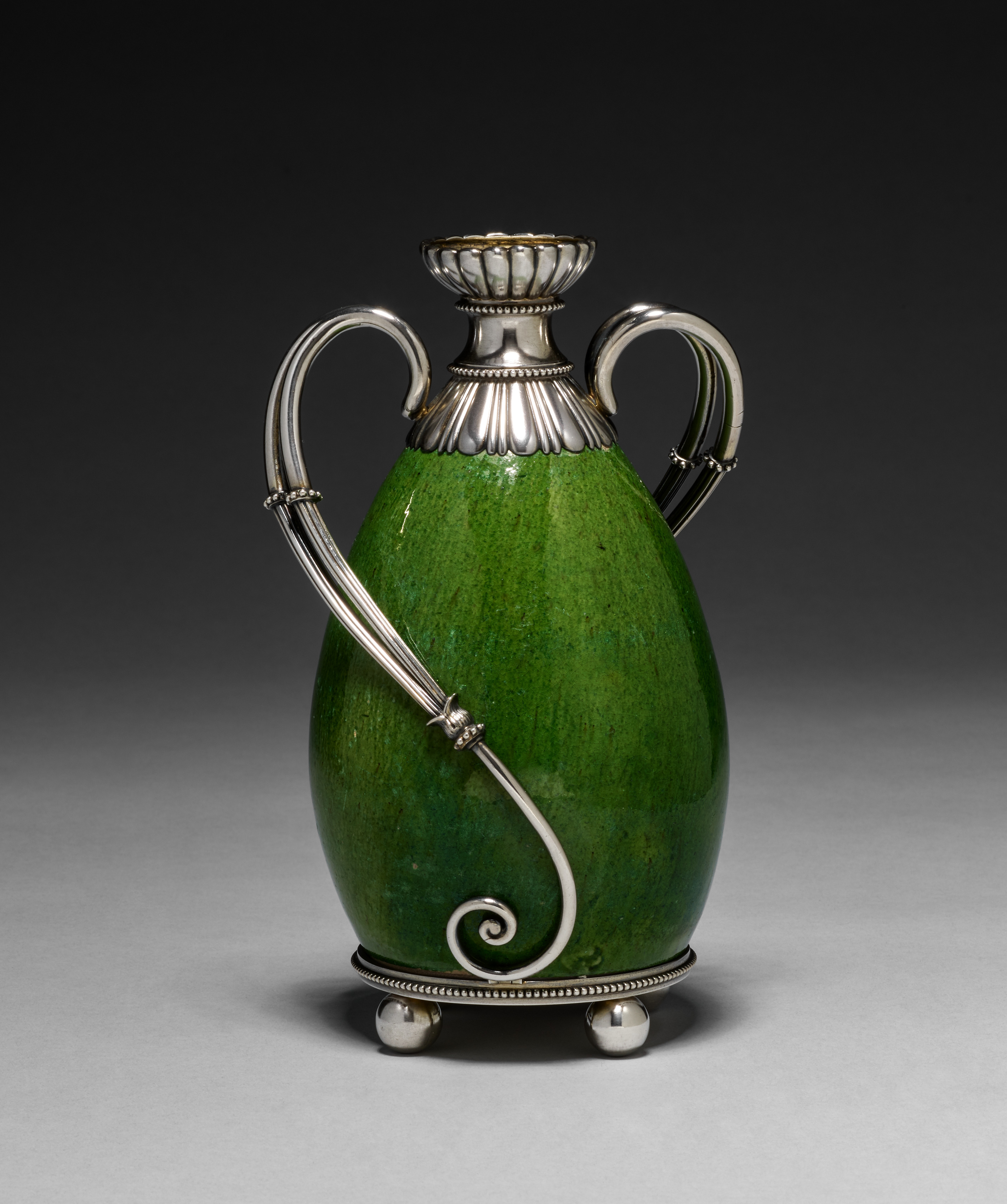 Green vase with a silver base, handles, and top; three feet; silver decorative elements; by House of Fabergé.