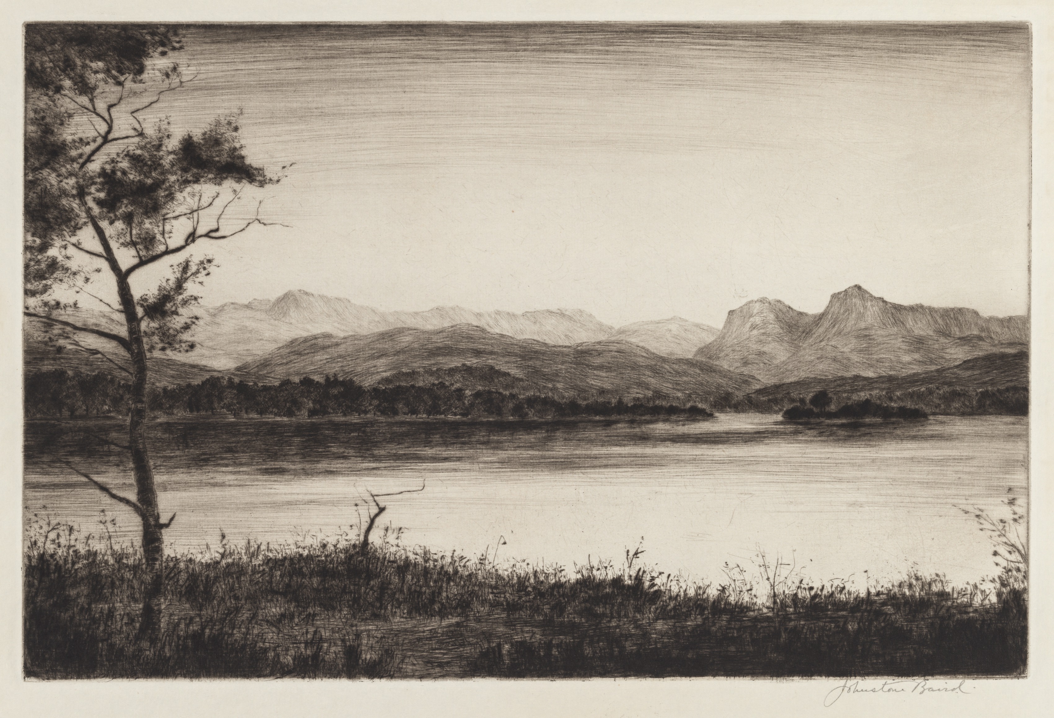 Black and white landscape drawing of a lake with mountains in the background. The lake is centered in the image and runs horizontally. It has a few ripples on its surface. There are trees and bushes along the shoreline. A tree is on the left side in the foreground. The foreground also has grass and other vegetation. The mountains are in the background, with the closest one having two peaks. The sky above the mountains is lighter than the rest of the sky. The artist's signature is in the bottom-right corner.