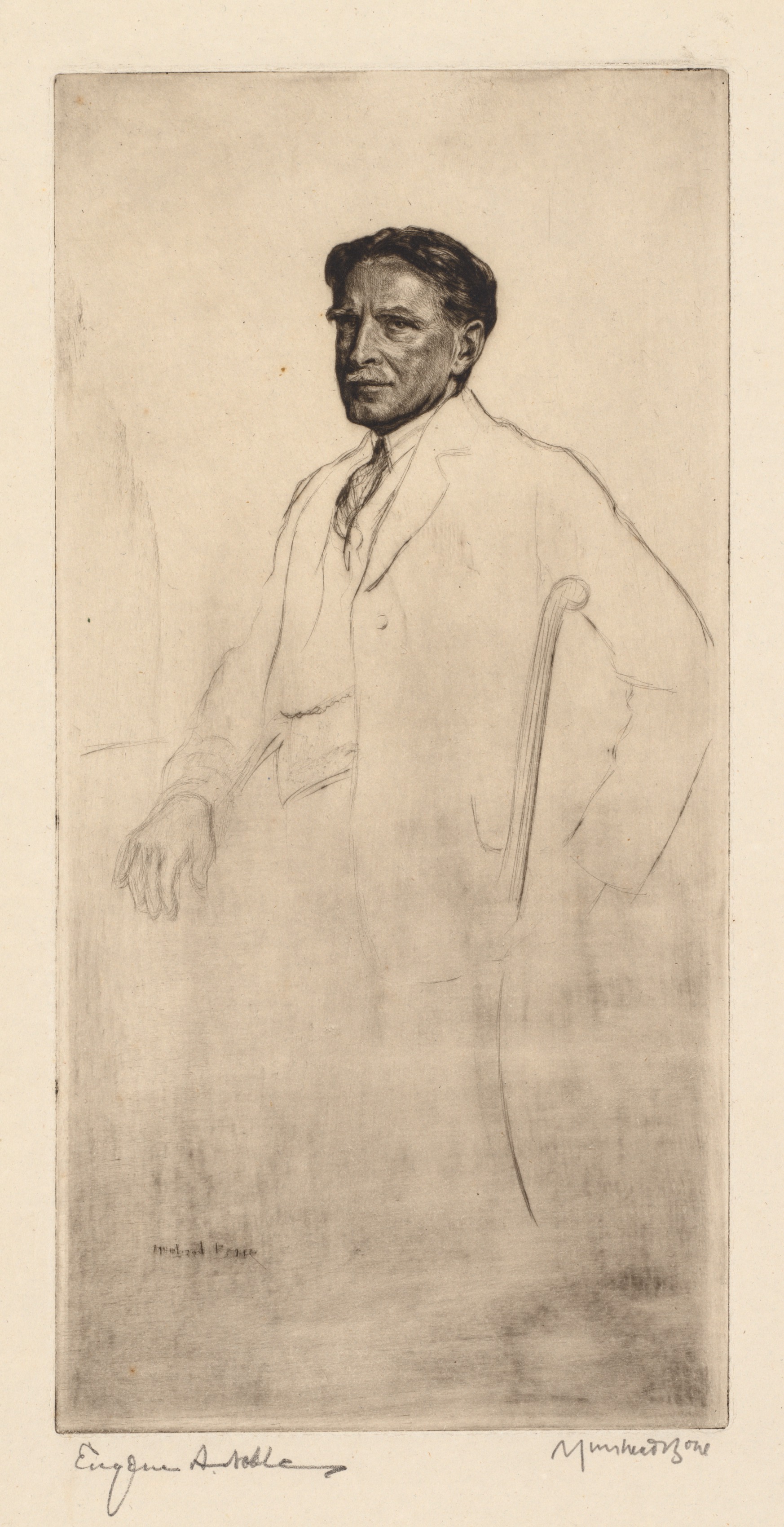 A black and white sketch of a man in a suit with one hand on a surface and the other on his hip. The man has dark hair and wears a white suit jacket over a white shirt and vest; he also wears a tie. The sketch is on a background that is lighter at the top and gets darker towards the bottom. The sketch is framed by a thin line. The background of the image around the sketch is off-white. The artist's signature is in the bottom-right corner and the subject's name is in the bottom-left corner.