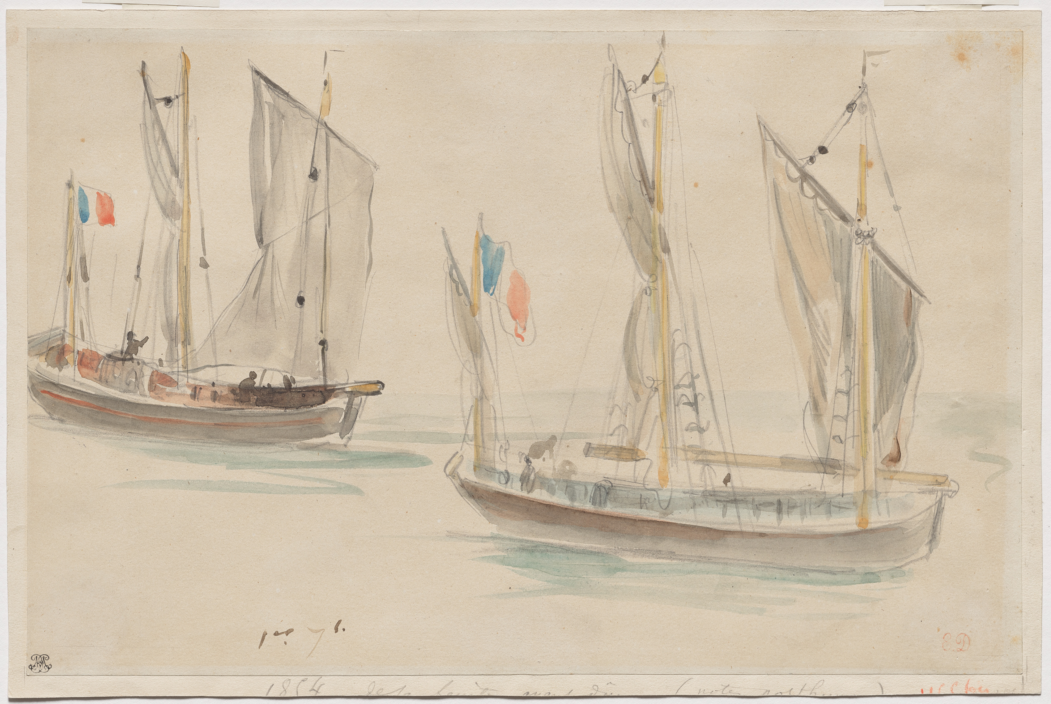Watercolor painting of two boats on water. The boats are sailing vessels with white sails, and each has a flag. The boat on the left is on the left side of the image and faces right. It has a red and white hull, a white sail on a single mast, and a French flag on the back. The boat on the right faces right, in the lower right corner of the image, and has a white sail on a single mast. The boat on the right has a white hull with a brown bottom. The background is a beige color with some blue and green hues to indicate water.