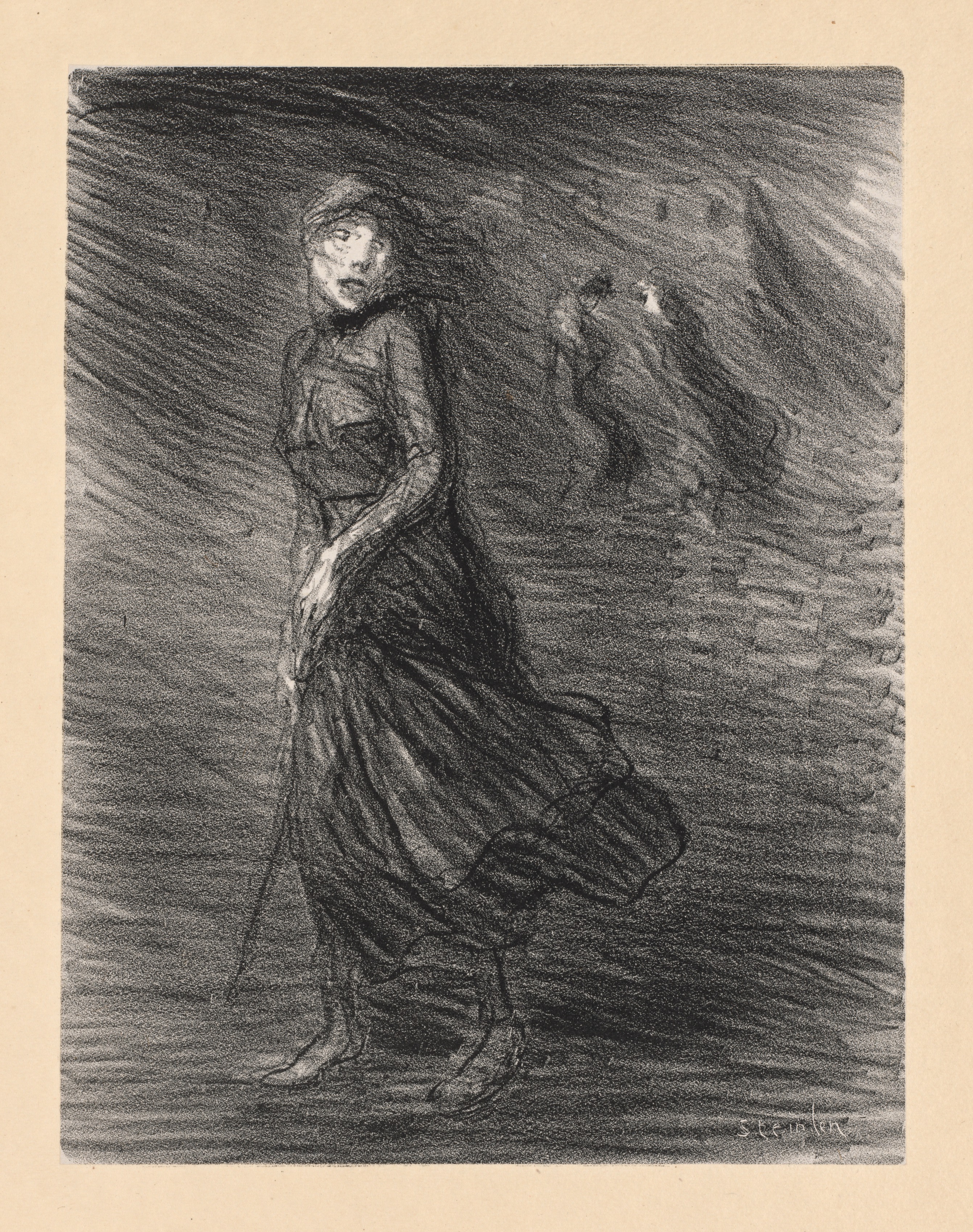 Black and white drawing of a woman in a long dress and headscarf. The woman's body faces right, her head turned to face forward. Her right leg is straight and her left leg is bent behind her. Her right arm is bent at the elbow and her left arm hangs by her side. She holds a stick or cane in her right hand. The background is dark and blurry, with two indistinct figures. The image has a beige border. The artist's signature appears in the lower-right corner.