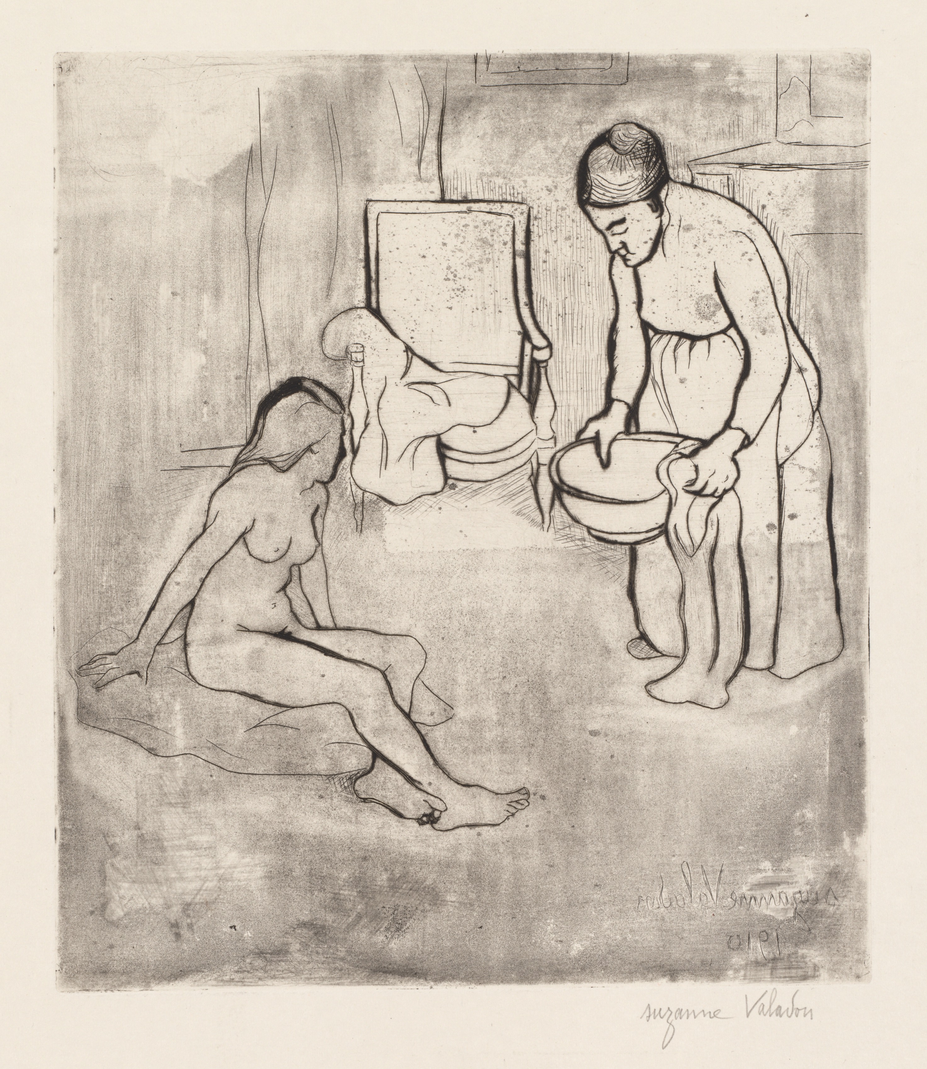Black and white drawing of two nude women in an interior room. The woman on the left sits on a cushion on the floor with her head tilted down and to the right. Her body faces slightly right; her right hand rests on the cushion beside her, her left hand on her thigh. She has long hair. The woman on the right stands, leaning slightly forward with her head down, looking at a large bowl she holds in both hands. She wears a long cloth wrapped around her waist. Behind the women is a chair with a towel draped over it. The walls have a darker tone at the top and lighter at the bottom. The artist's name appears in the bottom-right corner.