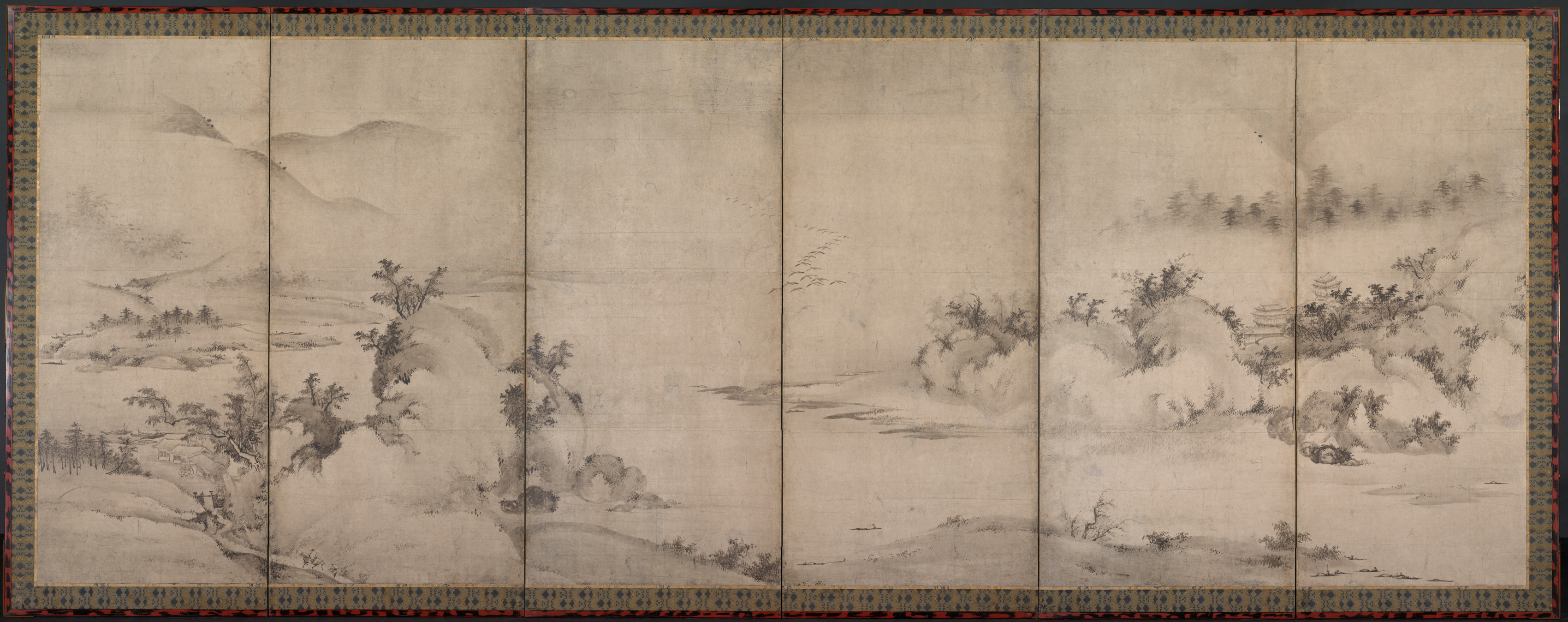 Landscape painting on six connected panels; beige background; ink; mountainous scene with hazy background; sparse trees; border around painting with blue, green, black, white and red colors. Landscape with Motifs from the Eight Views of Xiao-Xiang; Attributed to Unkei.