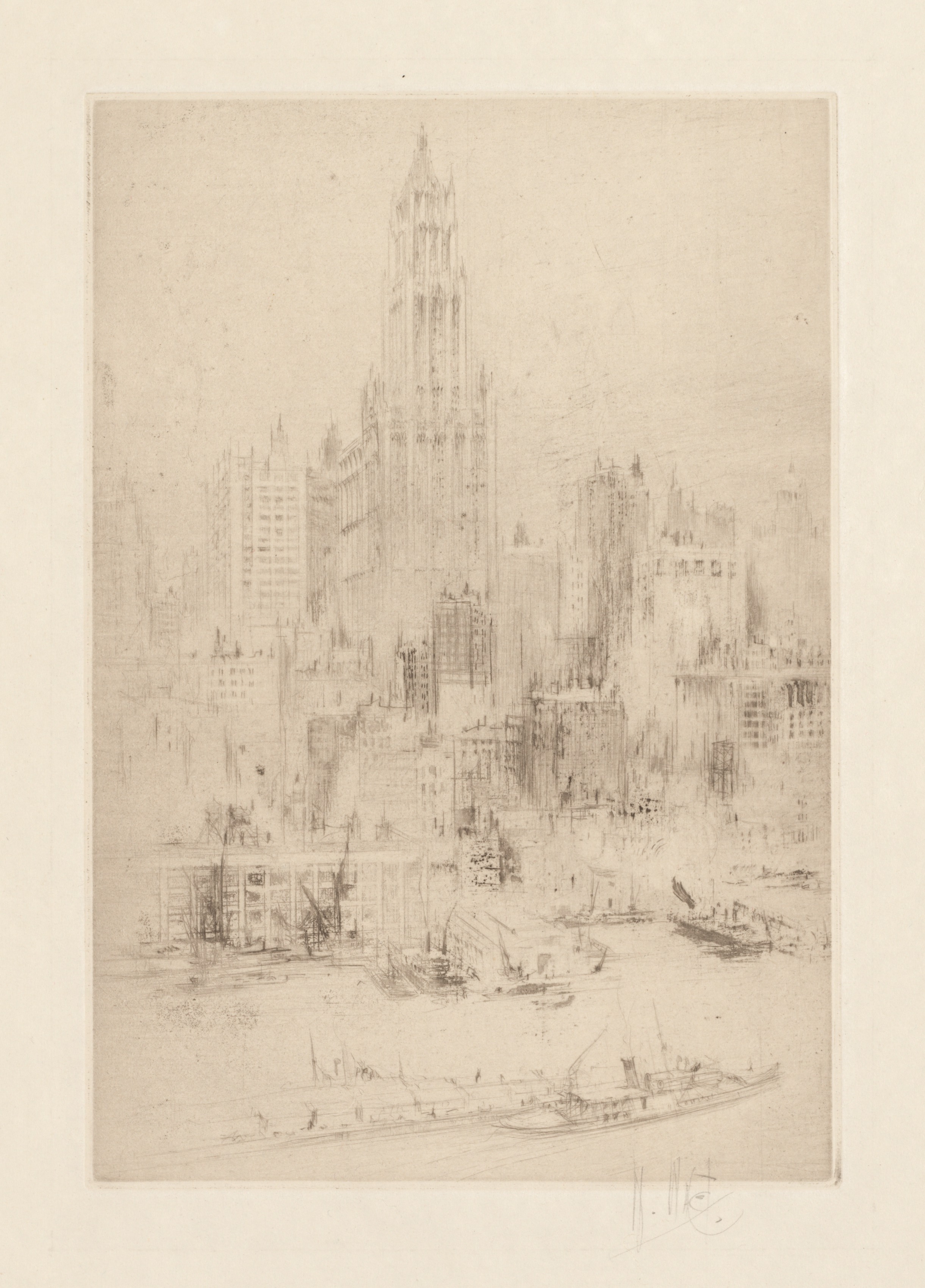 The image depicts a cityscape with a river and boats in the foreground and a tall building rising above the city. The artwork is rendered in shades of light brown on a white background. The tall building is located in the center of the image and has a pointed top. It appears to be made of stone or brick and has many windows. The building is surrounded by other buildings of varying heights. In the foreground, there are several boats on the river, which stretches across the bottom of the image. The boats are small and appear to be cargo vessels or ferries. The overall atmosphere of the image is one of a bustling urban center with a mix of old and new architecture. The image appears to be a drawing or painting of Downtown Manhattan, with the Woolworth Building prominently featured.
