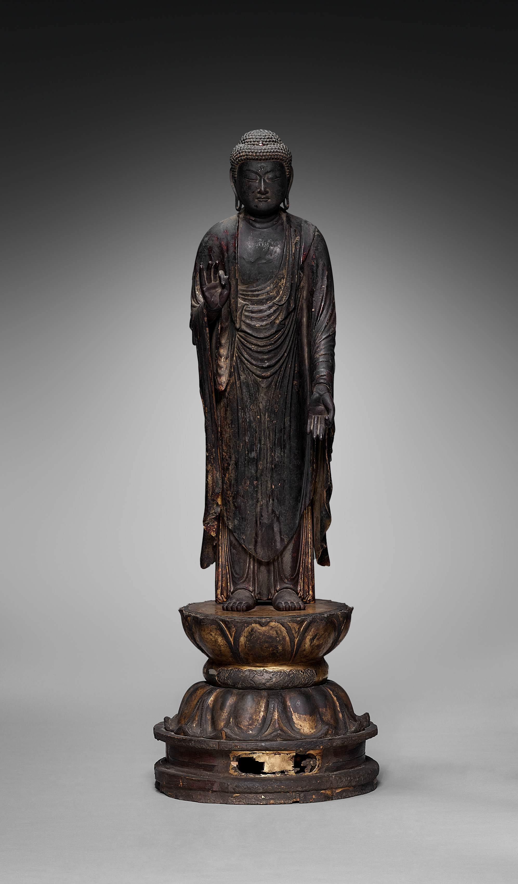 The image depicts the statue titled "Amida" by an unknown artist. The statue is of a figure with a serene expression standing on a lotus flower-shaped base. The figure has a rounded head with a textured top, representing a hairstyle. The figure's face is smooth with small features and slightly elongated ears. The figure wears a long robe with folds carved into it. The right hand is raised in a gesture and the left hangs down. The figure is dark-colored. The base is round and ornate with a hole. The background fades from dark at the top to light gray at the bottom.