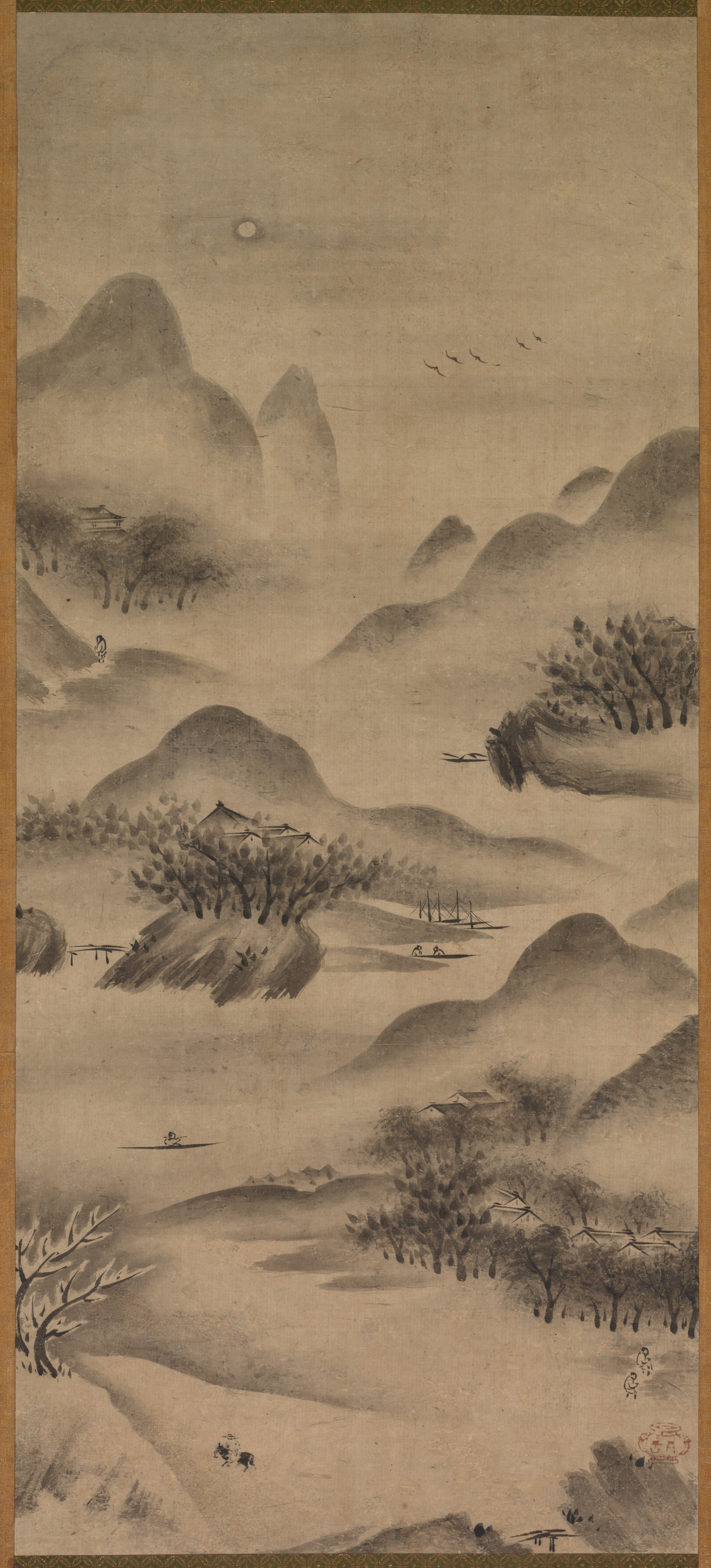Landscape by Shitao, a black and white painting on beige fabric. The painting depicts a landscape with rolling hills and mountains. A full moon is visible in the top left. Trees and bushes are scattered throughout the hills. A few buildings with pagoda-style roofs are visible. A body of water runs through the center with boats. Birds fly in the sky. A brown border is on the left and right edges.