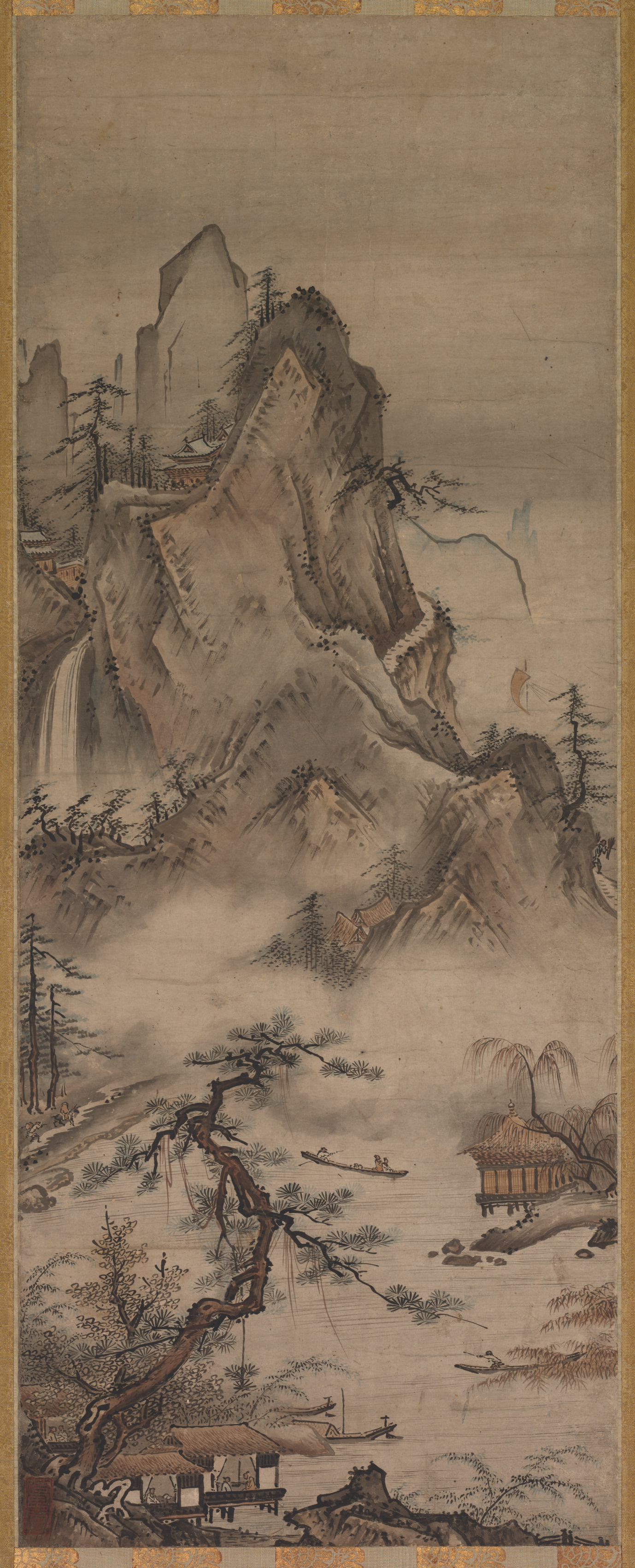 Landscape by Judō. A vertical, rectangular painting on beige background. A mountain range with several peaks occupies most of the painting. The mountains are depicted in shades of gray and brown. A waterfall cascades down one of the mountains on the left. Trees and bushes are scattered throughout the mountains. A misty fog covers the lower part of the mountains and the valley below. In the valley, there are several buildings with tiled roofs, including a hut with a thatched roof. A tree with a curved branch is in the foreground on the left. A river or stream runs through the valley. The painting has a gold border around the edges.