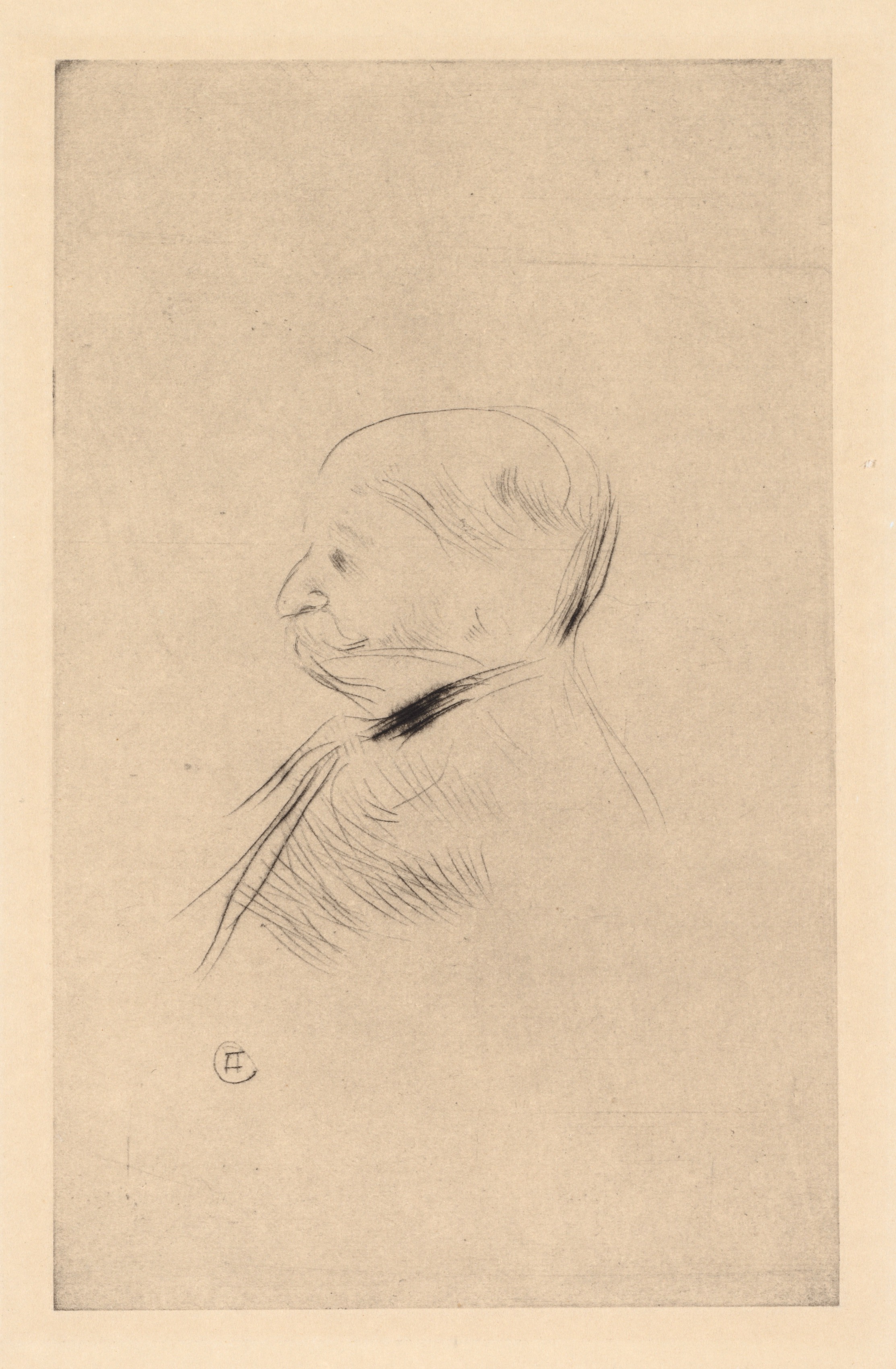 A black-and-white sketch on light-brown paper. The head and shoulders of a man are drawn in profile. He is facing left. His head is bald on top and he has a rounded jaw. A black collar is drawn around his neck. The lines are sketchy. A small circle with an 'H' is drawn below the head. The paper is rectangular and surrounded by a light-beige border.
