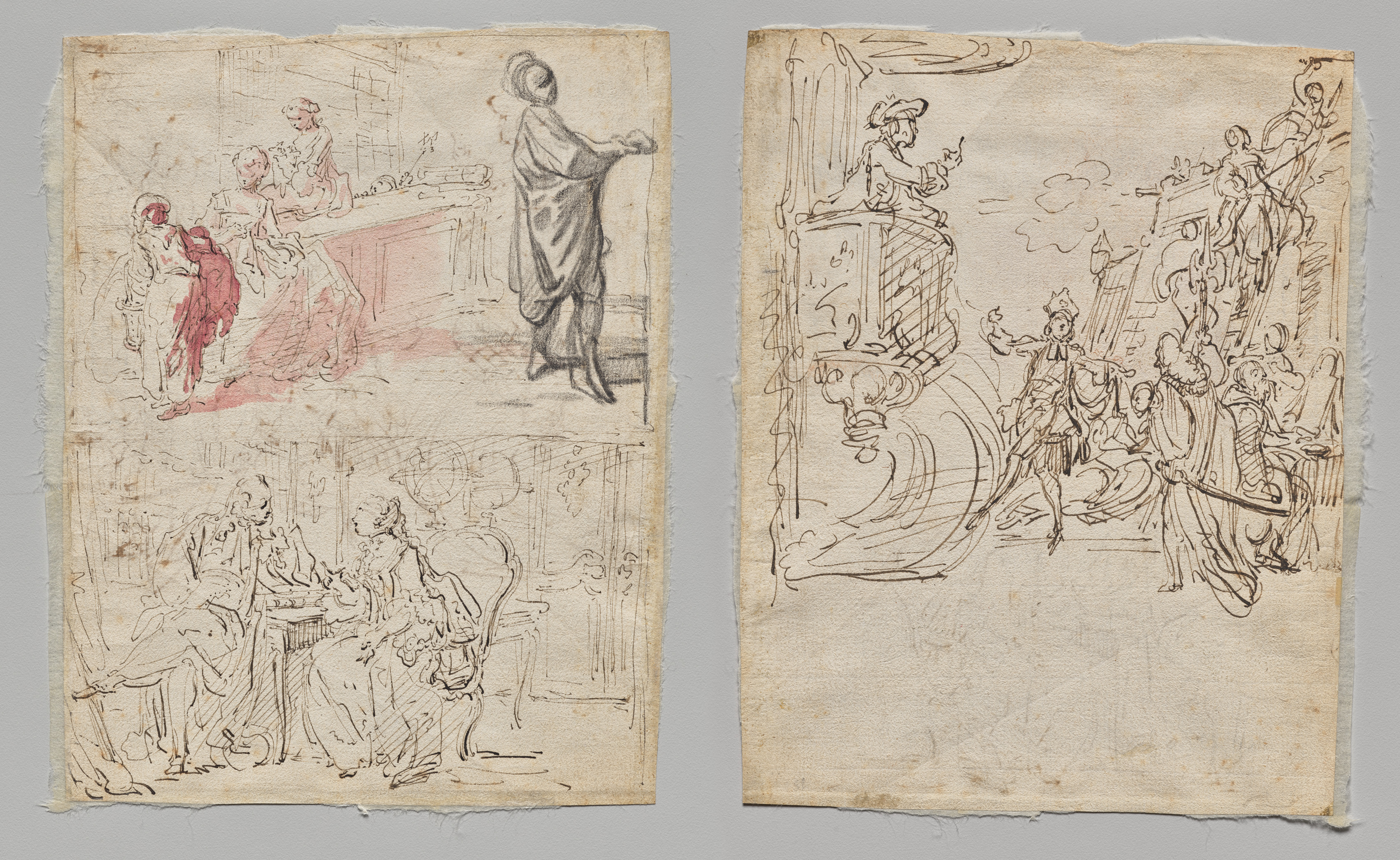 The image shows two aged, torn pieces of paper with drawings on them. The left piece of paper has a drawing divided into two sections. The top section shows a man in a robe standing with his arms outstretched, facing a woman in a red dress. Behind them, a woman sits at a table, and another person stands by the table. The bottom section shows a group of people sitting around a table. The right piece of paper has a single drawing of a group of people in various poses. A woman sits on a pedestal on the left side. On the right side, a group of people are standing and sitting. Some of them appear to be wearing elaborate costumes or wigs. The background of both drawings is a light brown color, with some darker brown spots and stains. The drawings appear to be in a sketchy, pencil-like style. The overall appearance is that of old, hand-drawn illustrations.