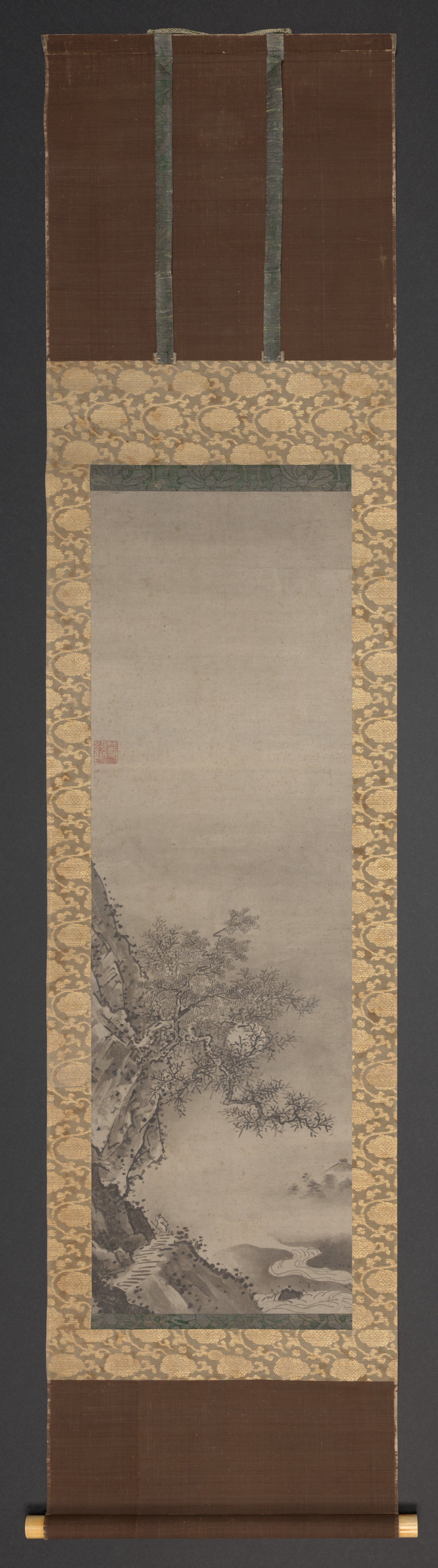 Vertical hanging scroll on dark brown silk with two light blue hanging strips at the top; decorated with a beige patterned brocade border; rectangular black and white ink painting on beige silk; mountainous landscape with distant water; figure on a path; tree branches; small red seal; dark brown lower section with golden scroll ends.