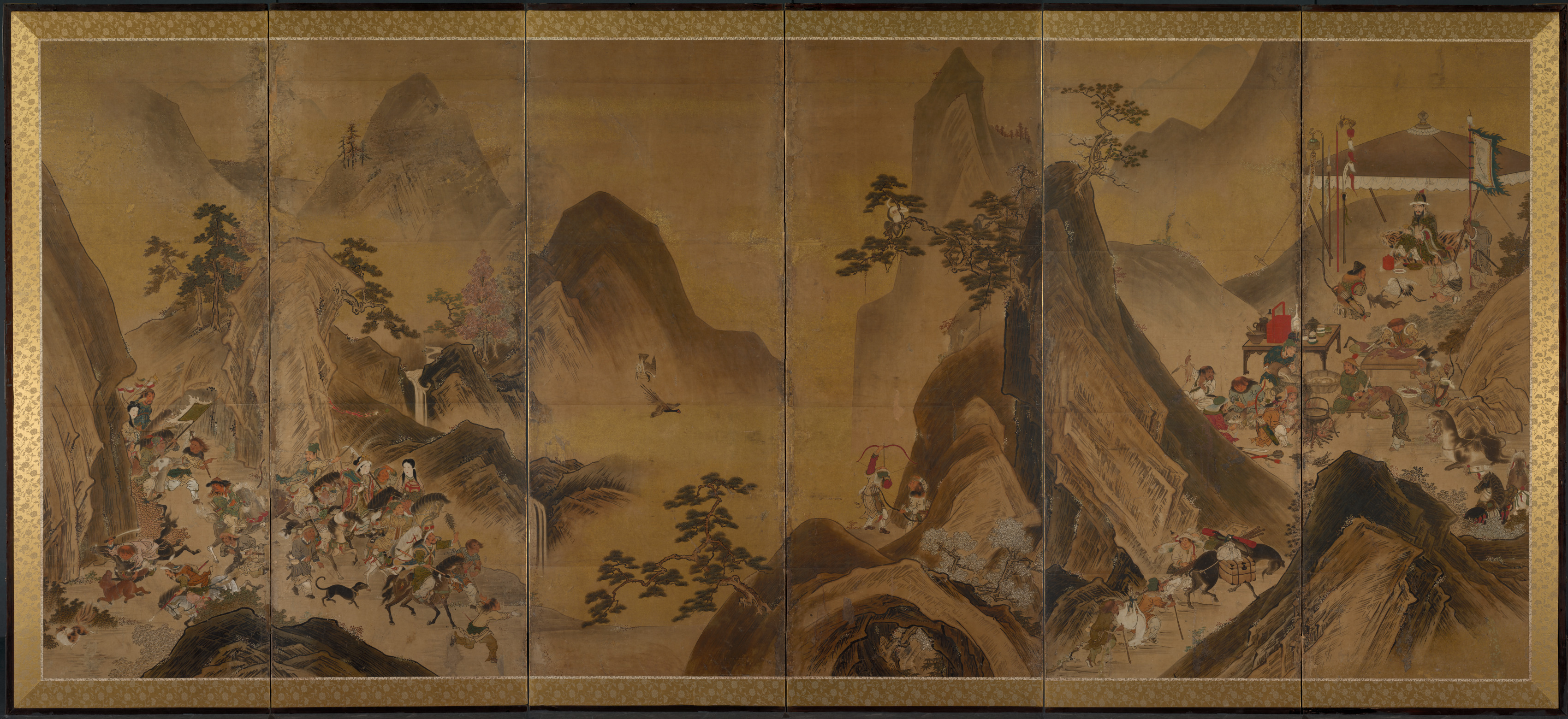 The painting "Tartars Hunting in a Mountain Landscape" by an unknown artist depicts a large scene divided into six panels. The dominant colors are shades of brown and gold. The landscape features multiple mountain peaks and slopes, some with sparse trees. In the foreground and middle ground, numerous figures of people on horseback and on foot are shown, some holding bows and arrows, engaged in hunting activities. The composition includes a few trees scattered across the mountainside and a tent structure at the top right. The bottom of the painting features a gold patterned border around the entire scene. The overall setting is a mountainous terrain with a hazy background.