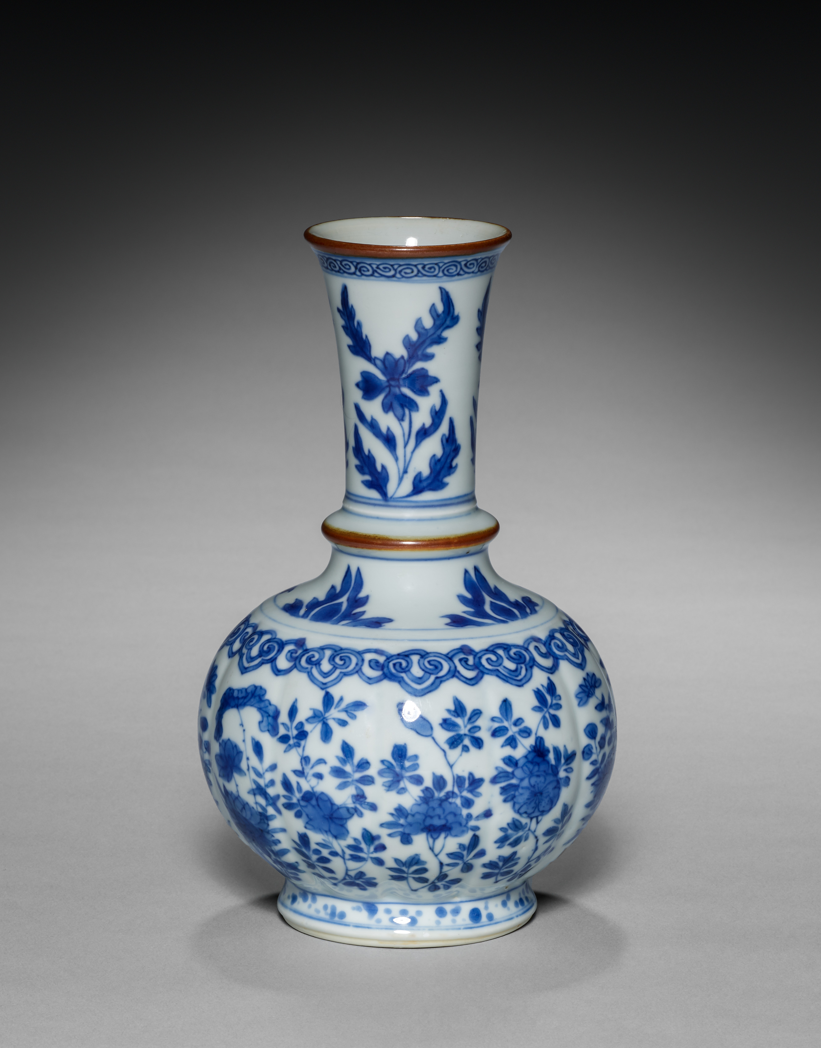 The vase has a white body with underglaze cobalt blue decoration. The vase has a bulbous bottom that tapers inward, forming a narrow neck which flares out slightly at the top. The base of the vase is small and round. The body of the vase features a floral pattern with various flowers and foliage. The neck of the vase has a similar floral pattern. There are decorative borders at the top and bottom of the vase's body and on the rim. The rim and the area where the body and neck meet have a brown color. The background of the image is a gradient from dark to light gray.
