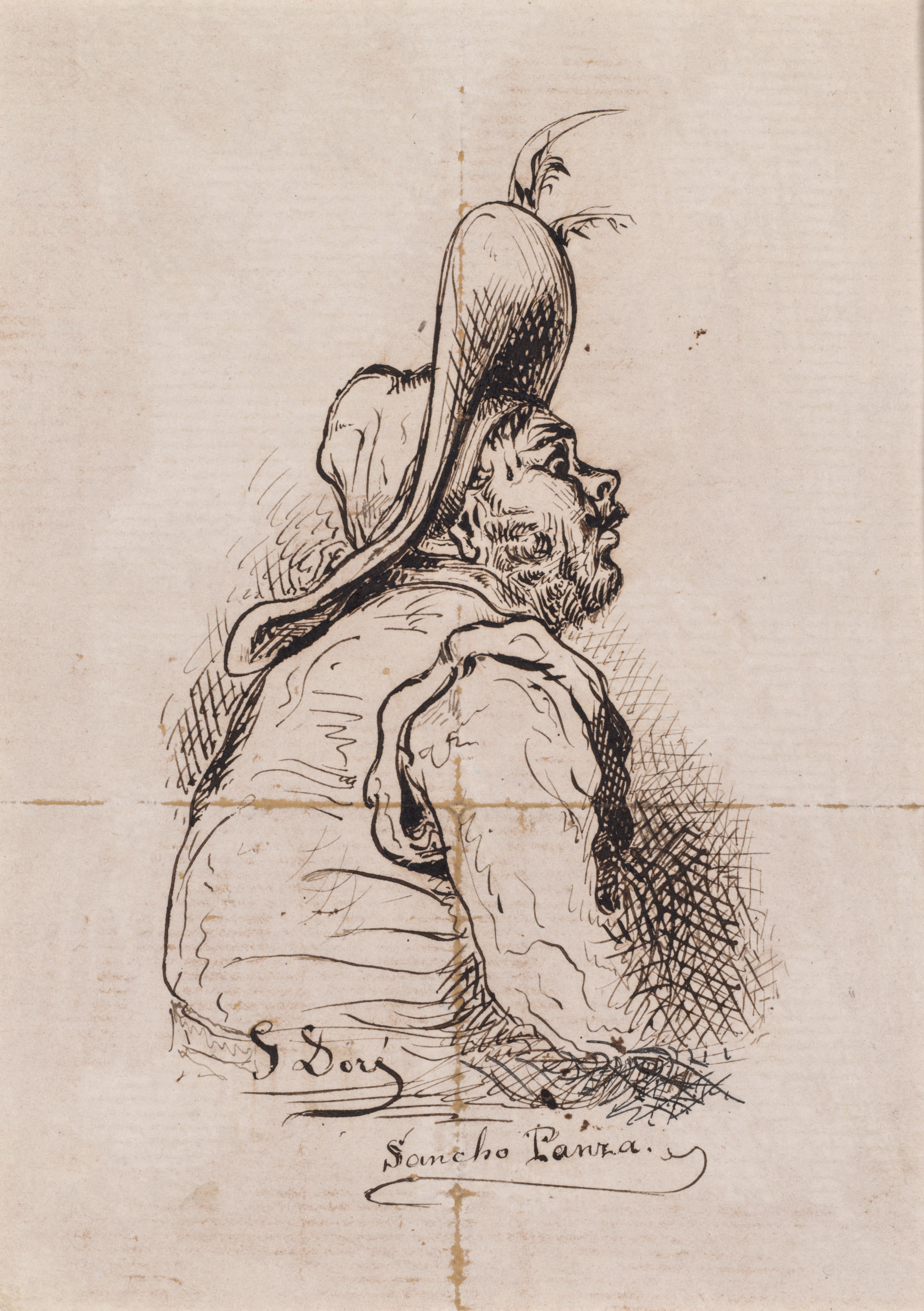 The drawing depicts a man viewed from behind and slightly to the side, with his head tilted back. He wears a long, curved hat with a short feather tucked into the band; the hat is pointed at the top and covers the back of his head and neck. The man has a beard and mustache. He is dressed in what appears to be a puffy-sleeved shirt or tunic. The man's body and hat are drawn in dark brown and black lines on a piece of off-white paper with a visible texture. There are darker smudges and discolorations on the paper, and two thin brown lines cross the paper horizontally. A flourish of a pen or brush with the words "Sancho Panza" is located at the bottom. More cursive writing appears to the left of the flourish but cannot be read.