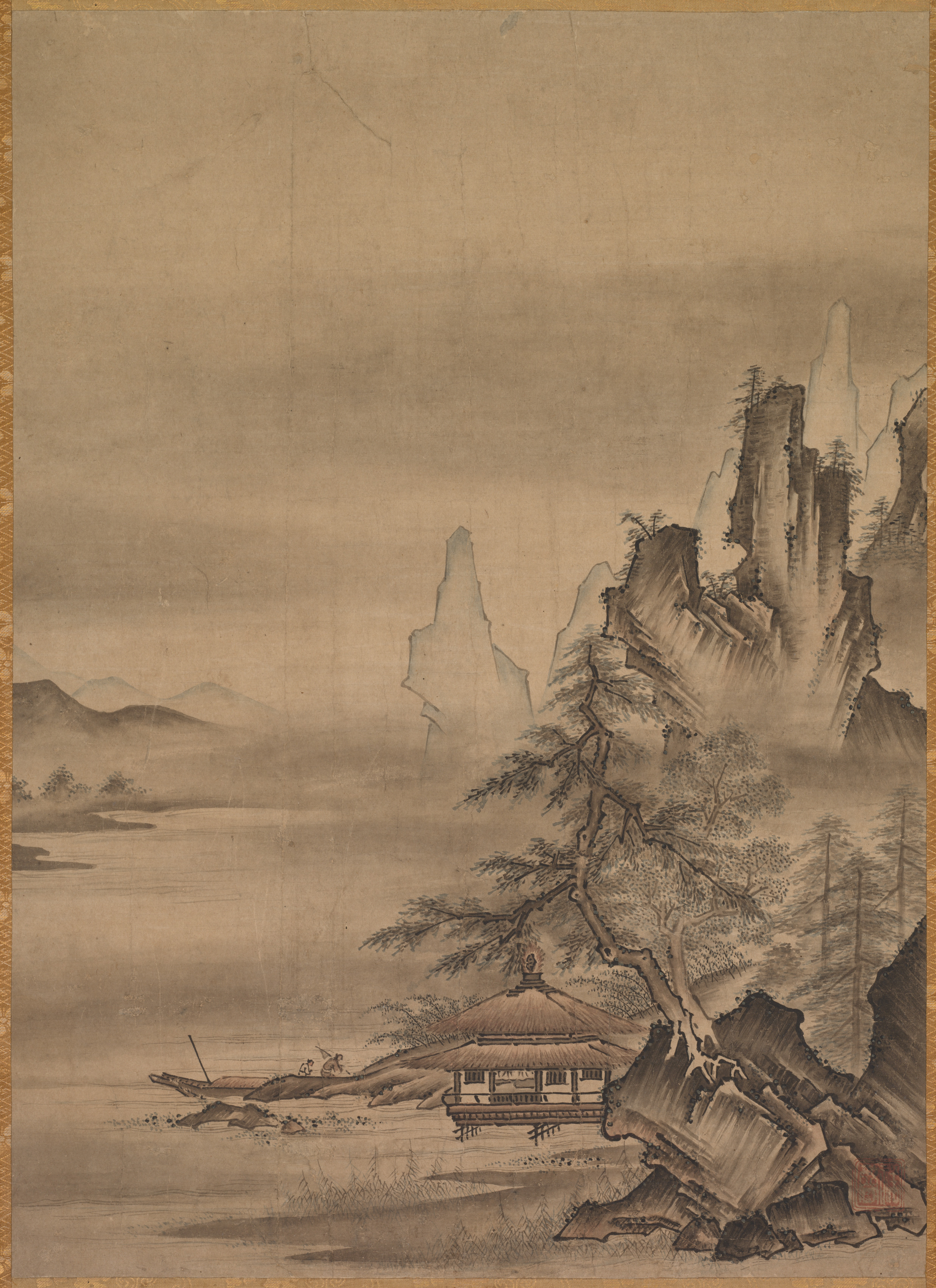 Sepia-toned landscape painting. A large body of water on left. Flat land on left with trees and shrubs. A large mountain on right. A small wooden hut on a rock on right bank. A person on left side of painting on a boat partially obscured by a tree. Mountains in background on left.