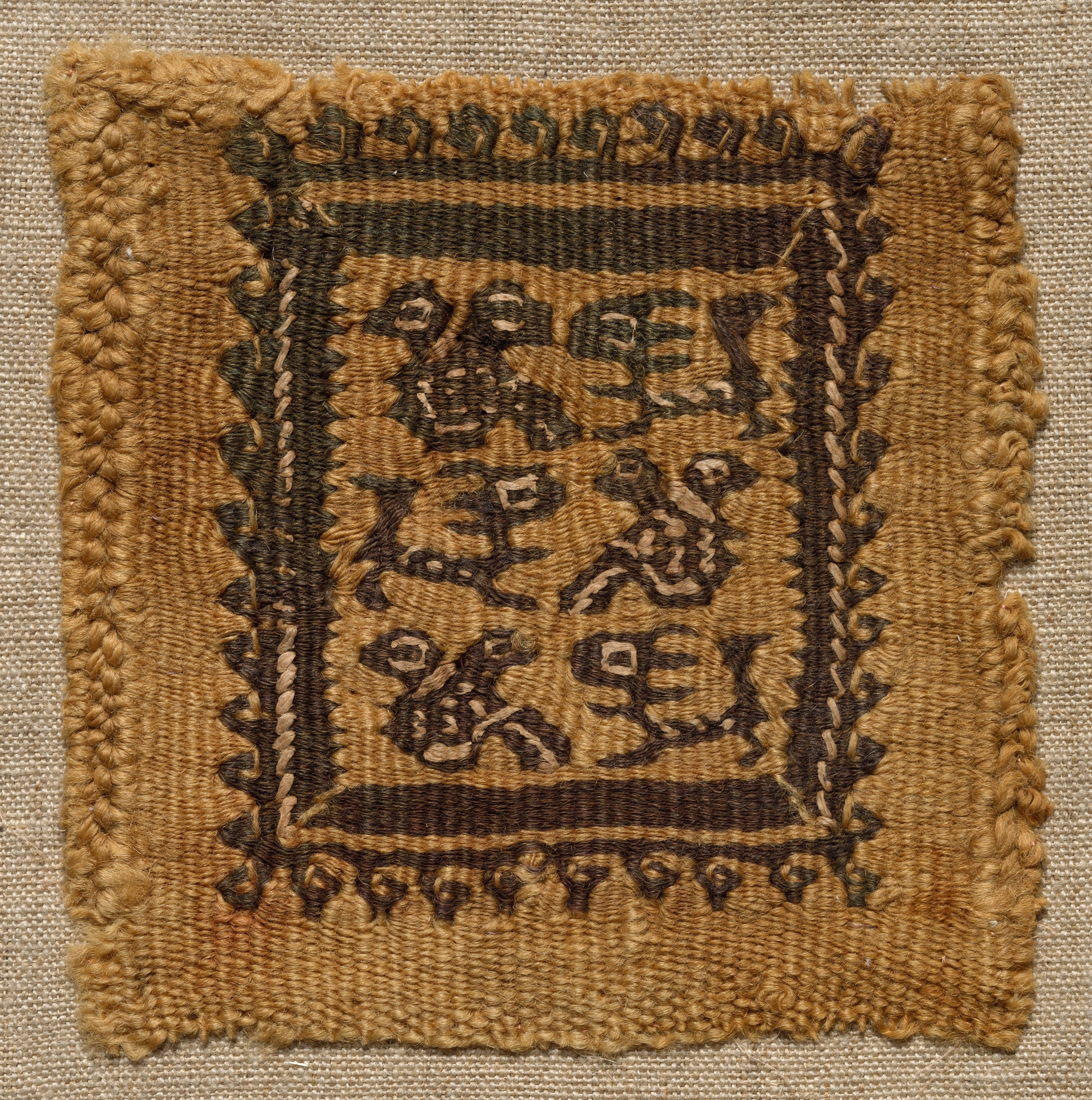 Brown square textile with frayed edges. Dark brown decorative pattern woven into square. The pattern consists of a thick border, a rectangular design with curved shapes within, and a thin border. Square mounted on light brown background. A segmentum from a tunic by an unknown artist.