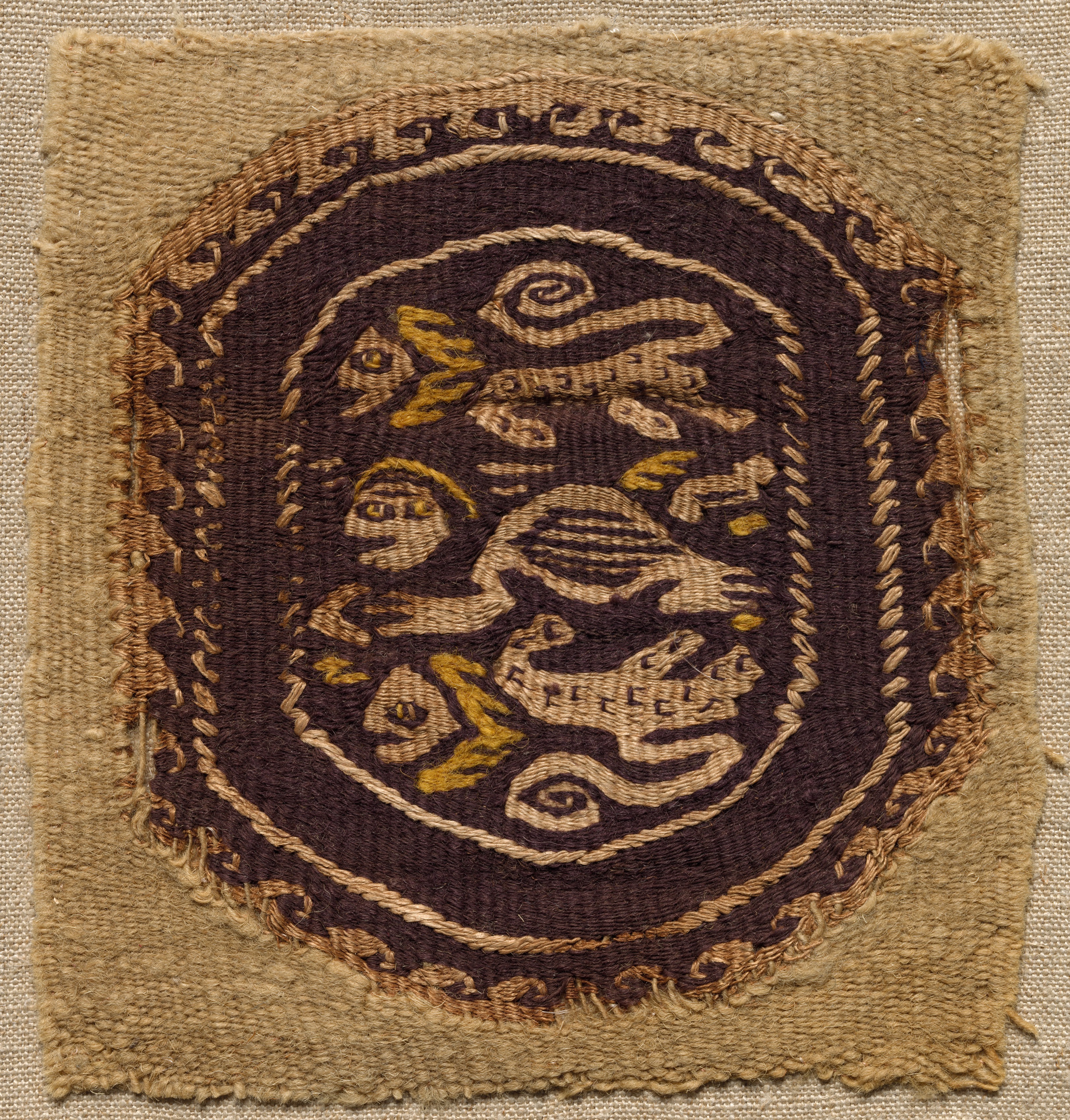 Brown and tan-colored textile fragment with an oval design. Dark brown background with tan and yellow embroidery. Oval design features a central motif surrounded by a rope-like border. The central motif appears to be a stylized animal or mythical creature. The design is symmetrical, with curved lines and tendrils extending from the central motif. The outer border of the oval is a rope-like pattern. The fragment has a rough, frayed edge. The background of the fragment is a tan-colored fabric.