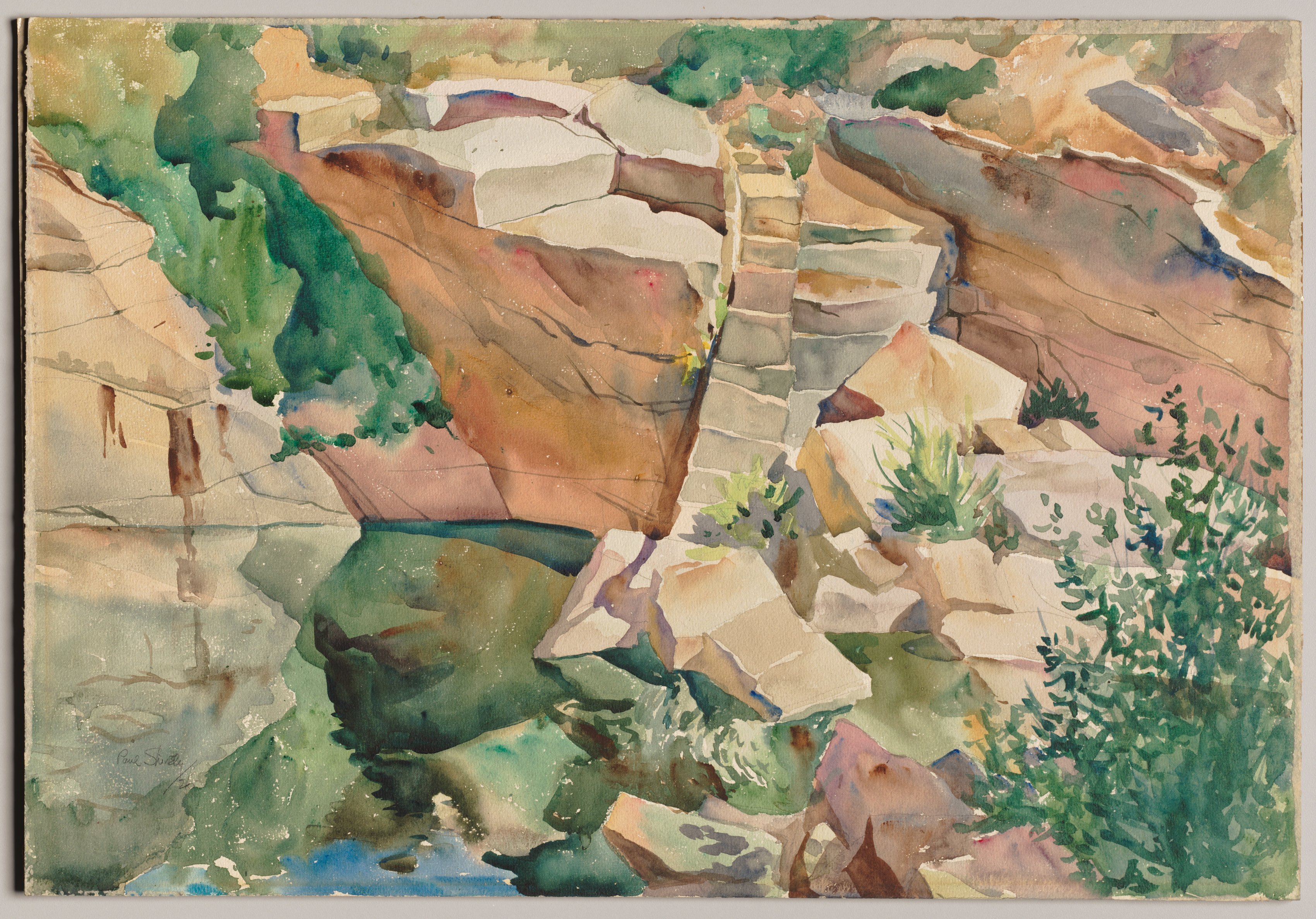 Watercolor painting by Paul Shively titled "Quarry Reflections". The painting depicts a rocky quarry with a small body of water. The quarry has steep, light-brown and tan rocky walls. Large, jagged rocks protrude from the walls and are scattered around the quarry floor. Some of the rocks have darker brown and reddish hues. The quarry floor contains a small pool of water that reflects the colors of the rocks. Green foliage and vegetation grow around the quarry, on top of the walls, and in the foreground. A small stone wall or pathway leads down into the quarry. The painting style is impressionistic, with loose brushstrokes and vivid colors. The overall atmosphere of the painting is serene and contemplative.