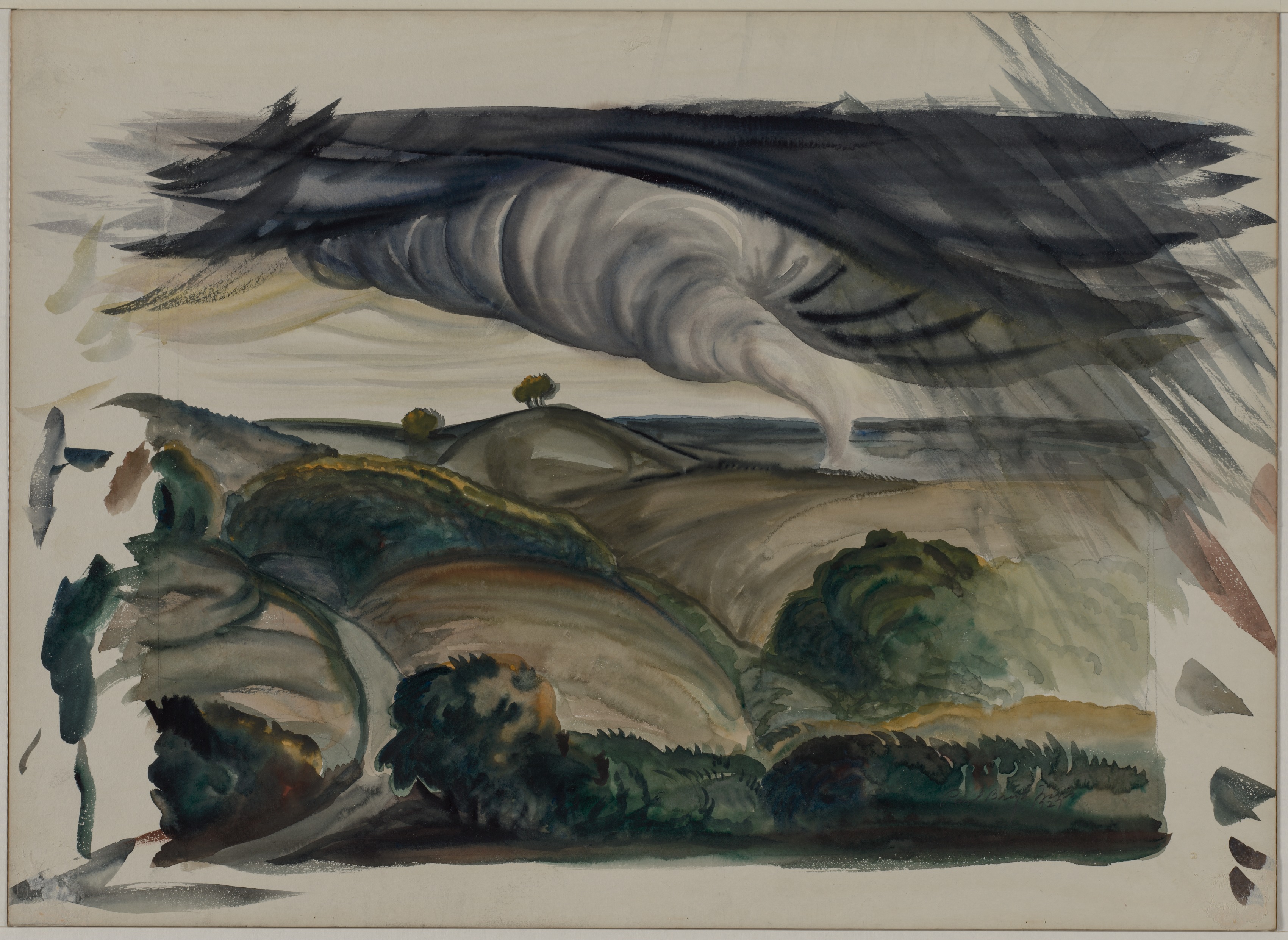 Tornado by Paul B. Travis. The painting depicts a landscape with a tornado. The tornado is large and centered at the top, dark gray and black at the top with white in the center. The tornado's funnel cloud extends down from a dark cloud. The landscape below has rolling hills, green and brown in color, some with trees. The sky behind the tornado is light gray. The painting has visible brushstrokes and abstract shapes, mostly on the right and left sides. The background of the painting is beige.