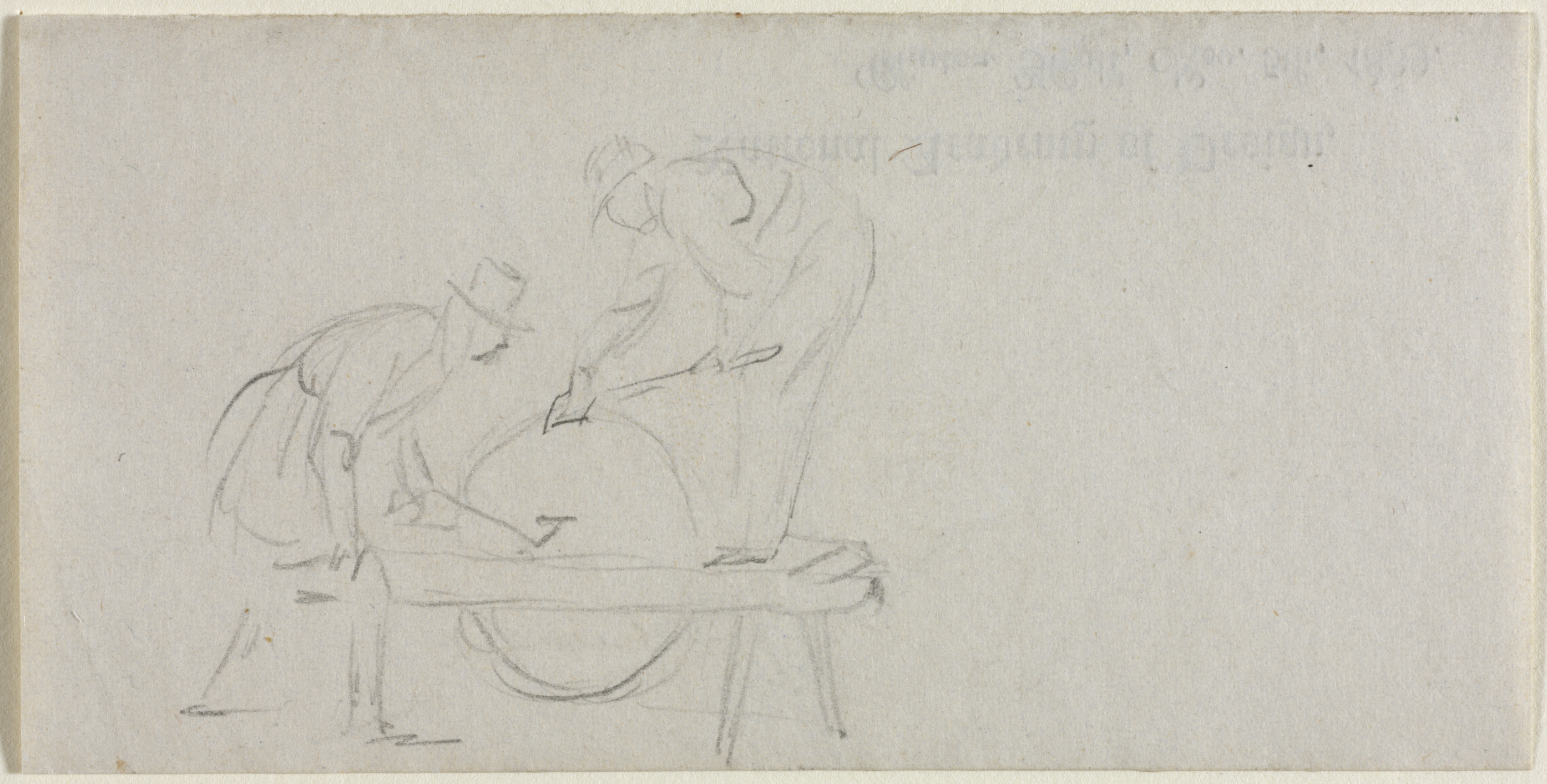 A pencil sketch on off-white paper depicts two men. The man on the left is hunched over with both arms on a surface in front of him; his head is tilted down. He wears a hat and an apron over his clothes. The man on the right stands behind him, leaning over, with one hand on the surface and one on the other man's back. The standing man's body faces right; his head is turned left and down. He wears a hat. A faint pencil inscription near the top right appears upside down. The sketch is titled "Grinding the Axe" by William Sidney Mount.