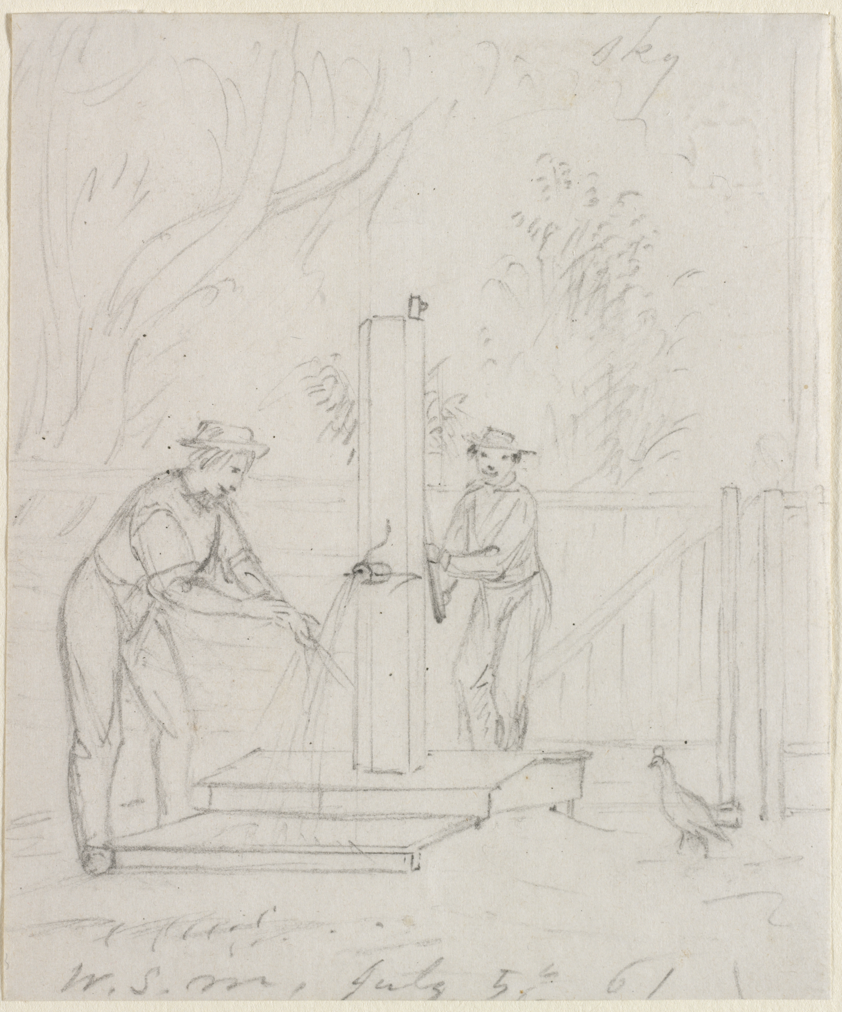 Pencil sketch on off-white paper of two men and a bird at a water pump. The man on the left wears a hat, long-sleeved shirt, pants and shoes; he faces right and leans over the pump with his right hand on the handle. The man on the right wears a hat, long-sleeved shirt, pants; he faces left with both hands on the handle. The pump is rectangular with a thin handle. A small bird with a long neck and tail stands to the right of the pump. In the background are sketched trees and a fence on the right. Some illegible writing appears at the bottom. The sketch is titled "At the Pump" and is by artist William Sidney Mount.
