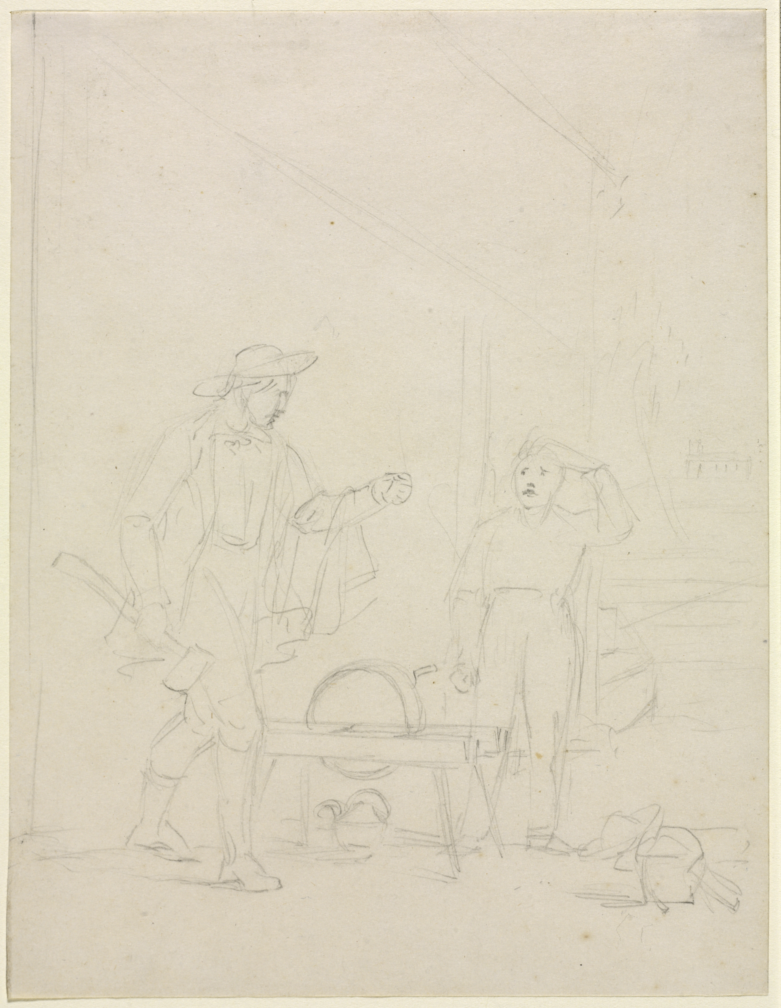 Pencil drawing on off-white paper of two men. The man on the left wears a brimmed hat with a chin strap, a buttoned jacket, and pants. He holds an object in his right hand. The man on the right wears a rounded hat, a short-sleeved shirt and pants. His right hand holds an object at his side and his left hand touches the top of his head. A table with a rounded top and one visible leg is between the men. The background includes faint lines suggesting walls and a roof. Small dark spots are scattered on the paper. The drawing is bordered in cream.