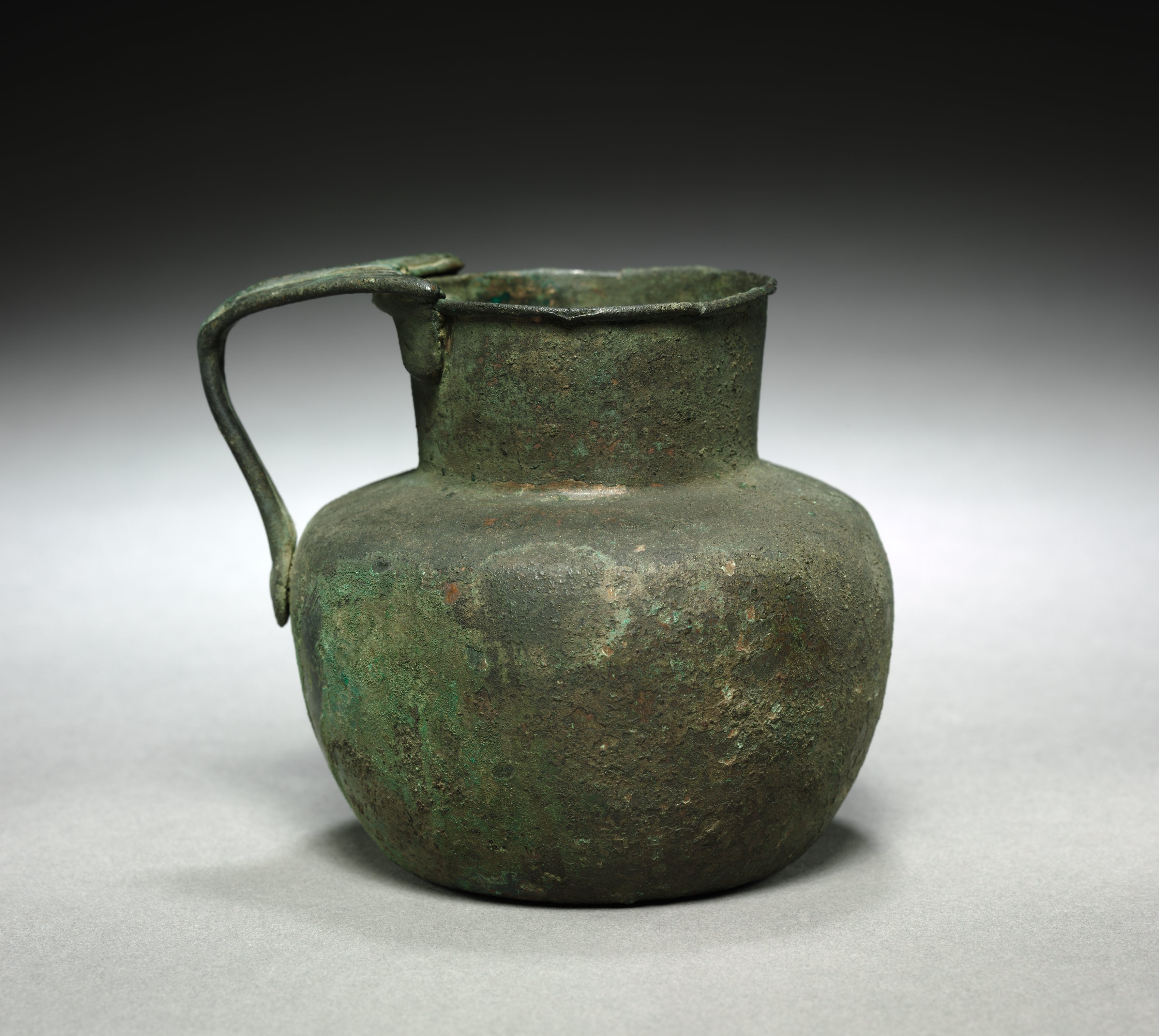 The Jug or Pitcher by an unknown artist depicts a green, aged metal vessel with a rounded body and a short neck. The jug's body is bulbous and roughly spherical in shape. The neck is short and slightly narrower than the body. A handle extends from the left side of the jug, curving upward and then back down to attach to the body. The jug's surface is covered in a green patina. The background is a gradient from black at the top to white at the bottom, with the jug casting a shadow on the surface below it.