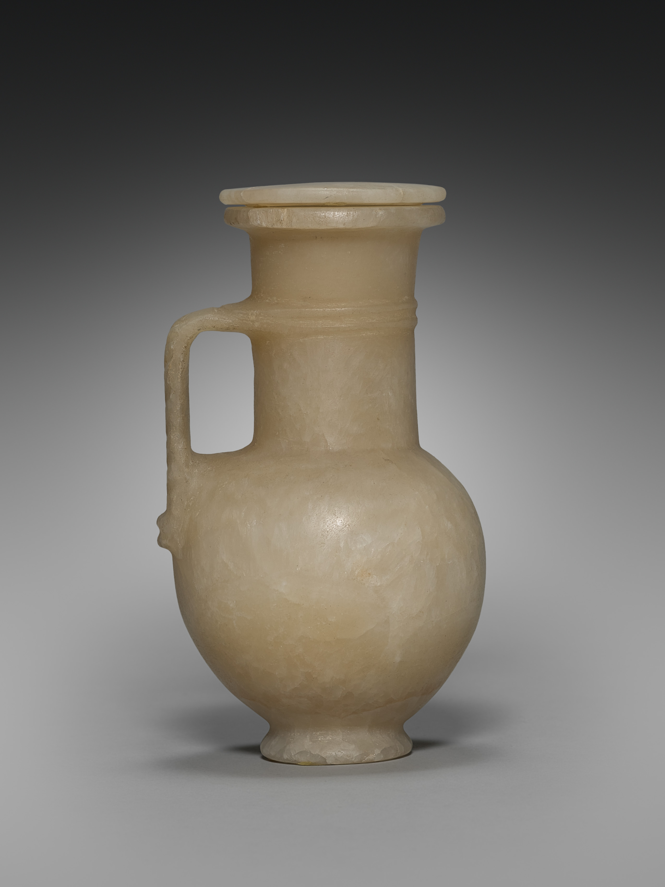 Long-Necked Flask with Strap Handle and Lid by Unknown. The object is a beige-colored flask with a narrow neck and a wide body. The flask has a strap handle on the left side. The neck is long and cylindrical with a slight narrowing at the top. The mouth of the flask has a small lip around the edge. The body of the flask is bulbous. The base of the flask is small and rounded. The background is a gradient from black at the top to gray at the bottom. The flask casts a shadow on the surface below it.