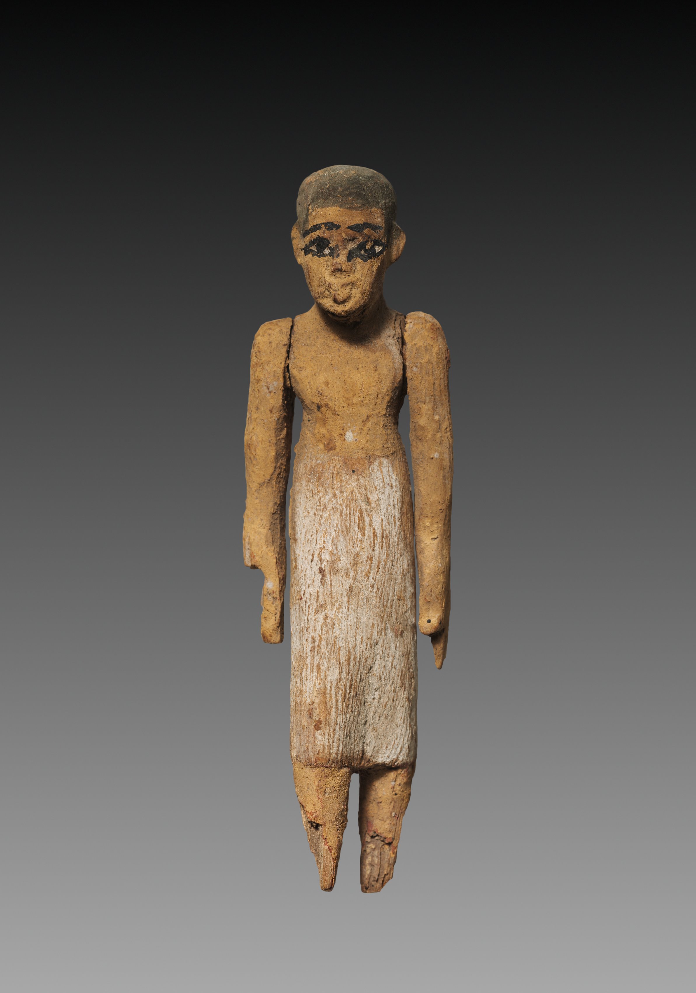 A wooden figure of a man with a short, dark haircut. He has a neutral expression on his face, with black painted eyebrows and eyelashes. His body is painted with a white loincloth that extends to his knees. The figure's arms are at his sides, with his hands intact. The wood is weathered and worn, with visible cracks and discoloration. The background is a gradient of dark to light gray. The title of the piece is "Model Figure of a Man, Perhaps a Boat Attendant".