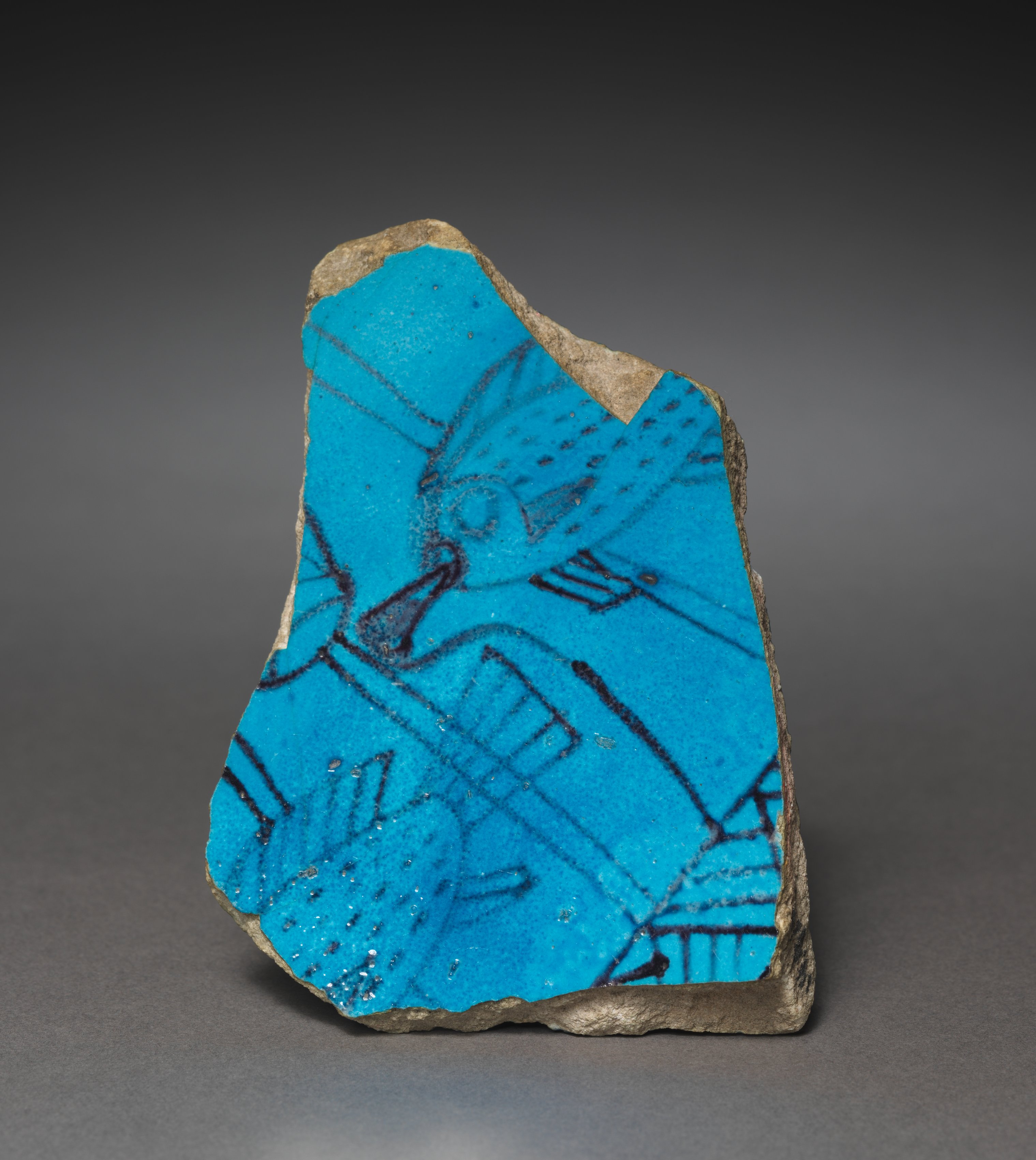 The Marsh Bowl Fragment by an unknown artist features a broken piece of ceramic. The piece has a bright blue surface. A design of black lines forming geometric shapes and a bird-like figure. The background fades from dark gray at the top to light gray at the bottom. The ceramic fragment sits on a gray surface.