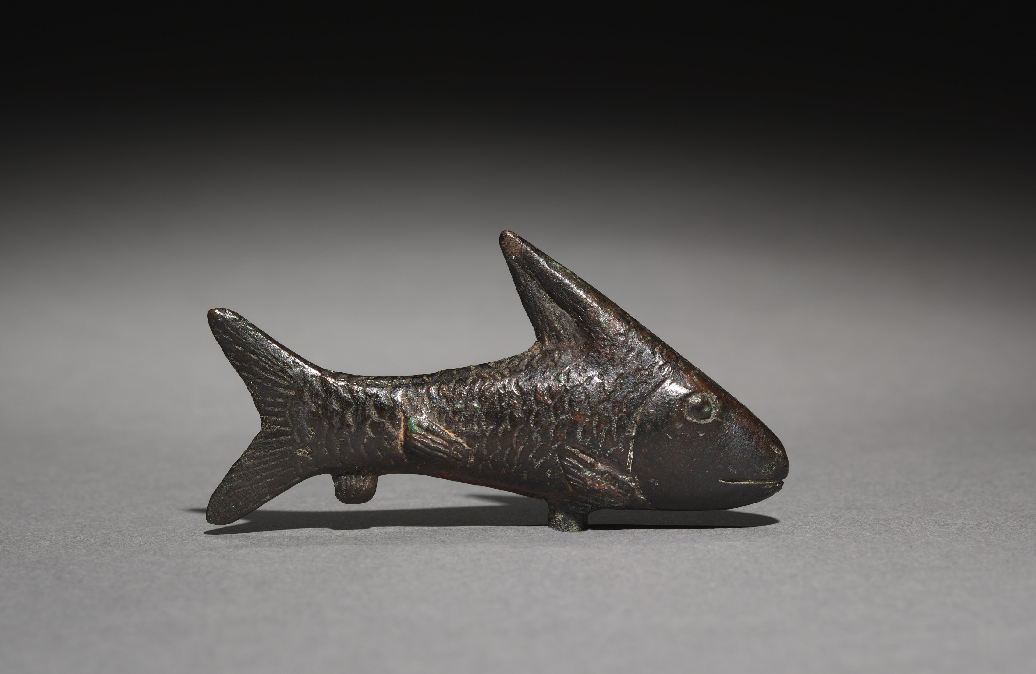 The Small Lepidotus Fish by Pablo Gargallo is a sculpture of a fish. The fish has a dark brown patina. The body is depicted with scales carved into the metal. The fins are raised. The head has a small eye and a closed mouth. The sculpture is viewed from the side, with the head to the right. Two small feet are visible underneath. The background is gray, with a gradient from dark at the top to light at the bottom. A shadow is cast under the sculpture.