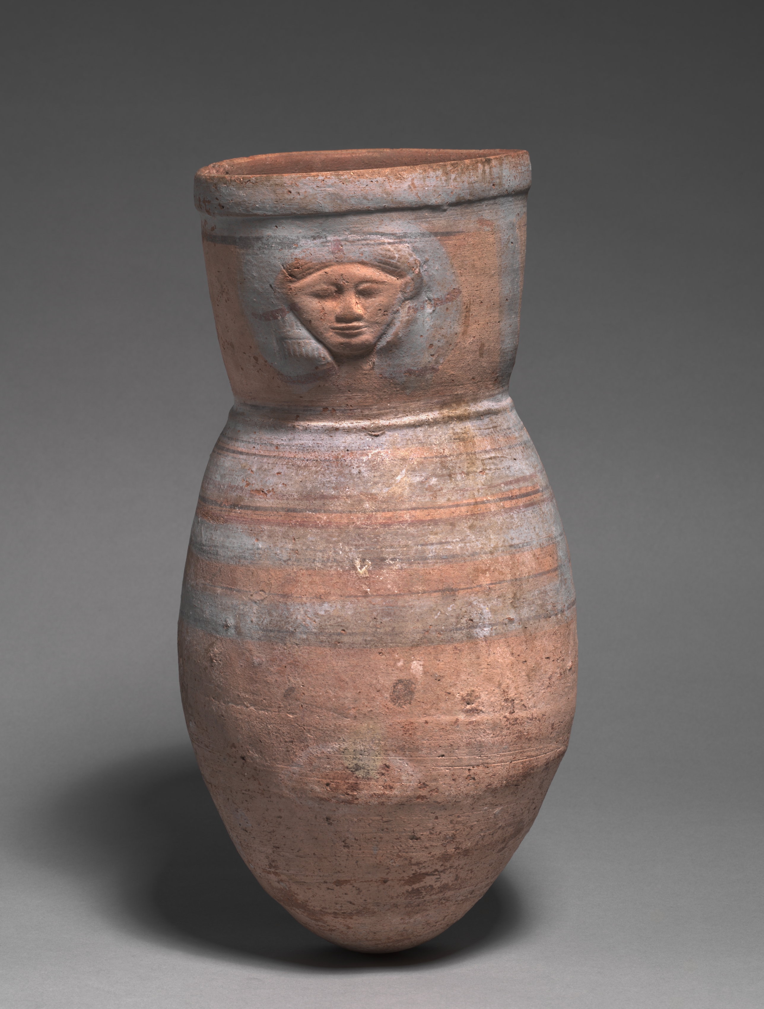 The Hathor Jar is a ceramic vessel with a distinctive shape. The jar has a narrow, rounded bottom that widens slightly towards the middle and then tapers up to a wide mouth. The body of the jar is primarily reddish-brown in color, with horizontal stripes of blue and reddish-brown around the middle section. A relief of a woman's face is on the upper portion of the jar; she appears to be wearing a headband or a crown. The background of the image is dark grey.