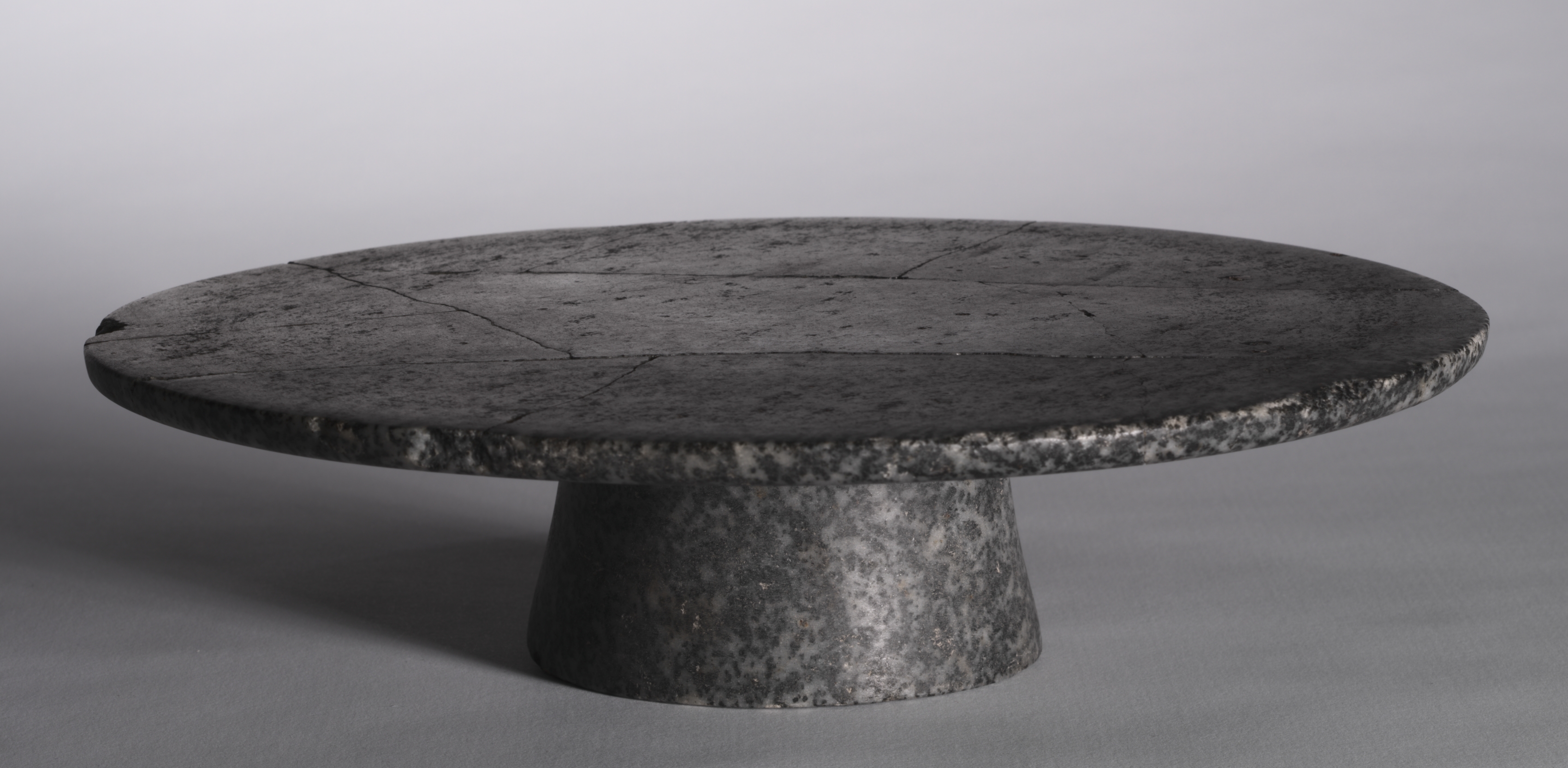Dark gray table with lighter gray and white speckles. Round top, flat surface with cracks and rough edges. Thick, short cylindrical base. Light gray background.