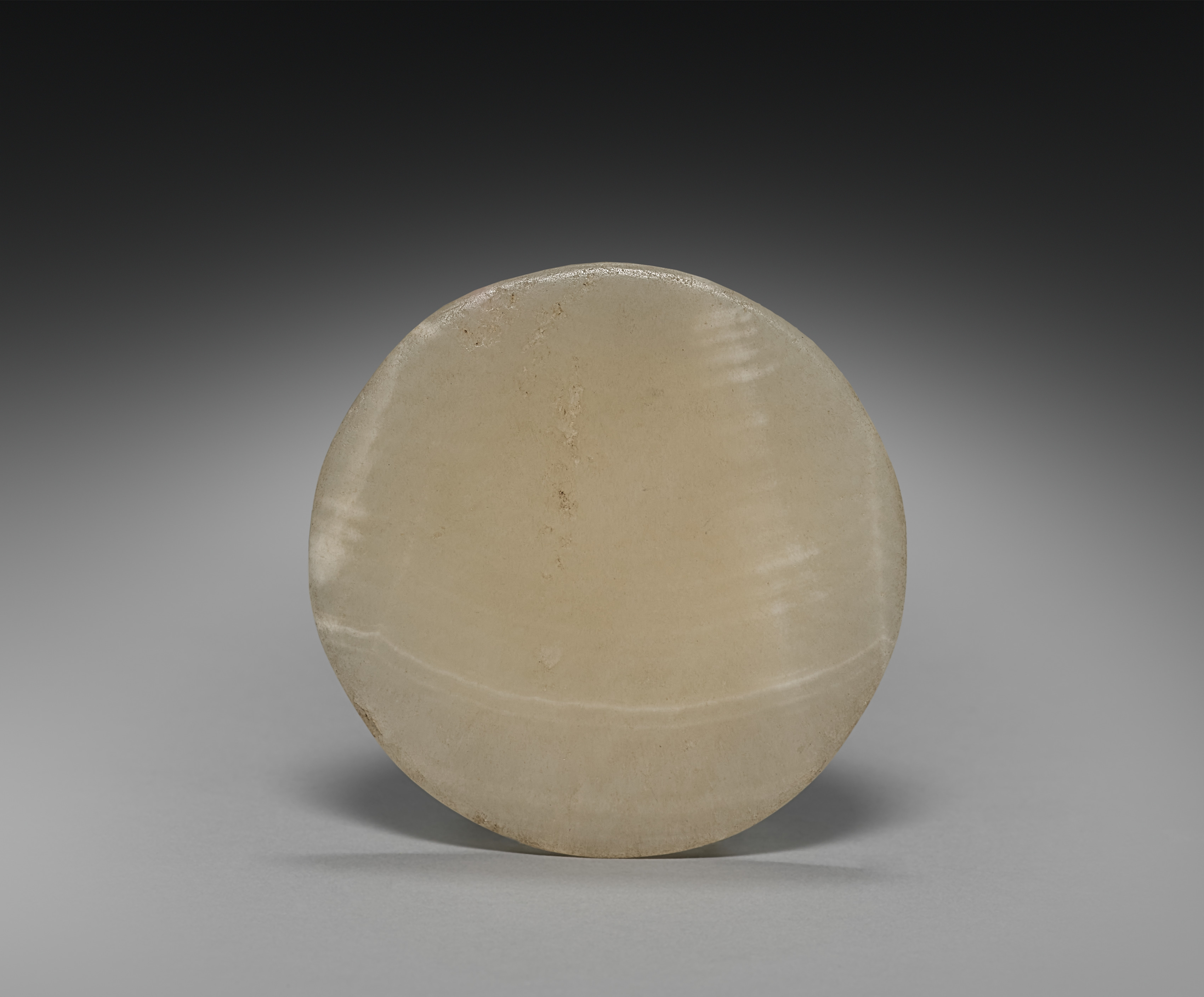 Round, flat, beige-colored lid with slightly raised edge, smooth surface, and subtle scratches and marks; circular shape with no visible handles or openings; placed on gray surface with shadow underneath; gradient background transitioning from dark at top to light at bottom. Long-Necked Flask with Lid (Lid) by artist.