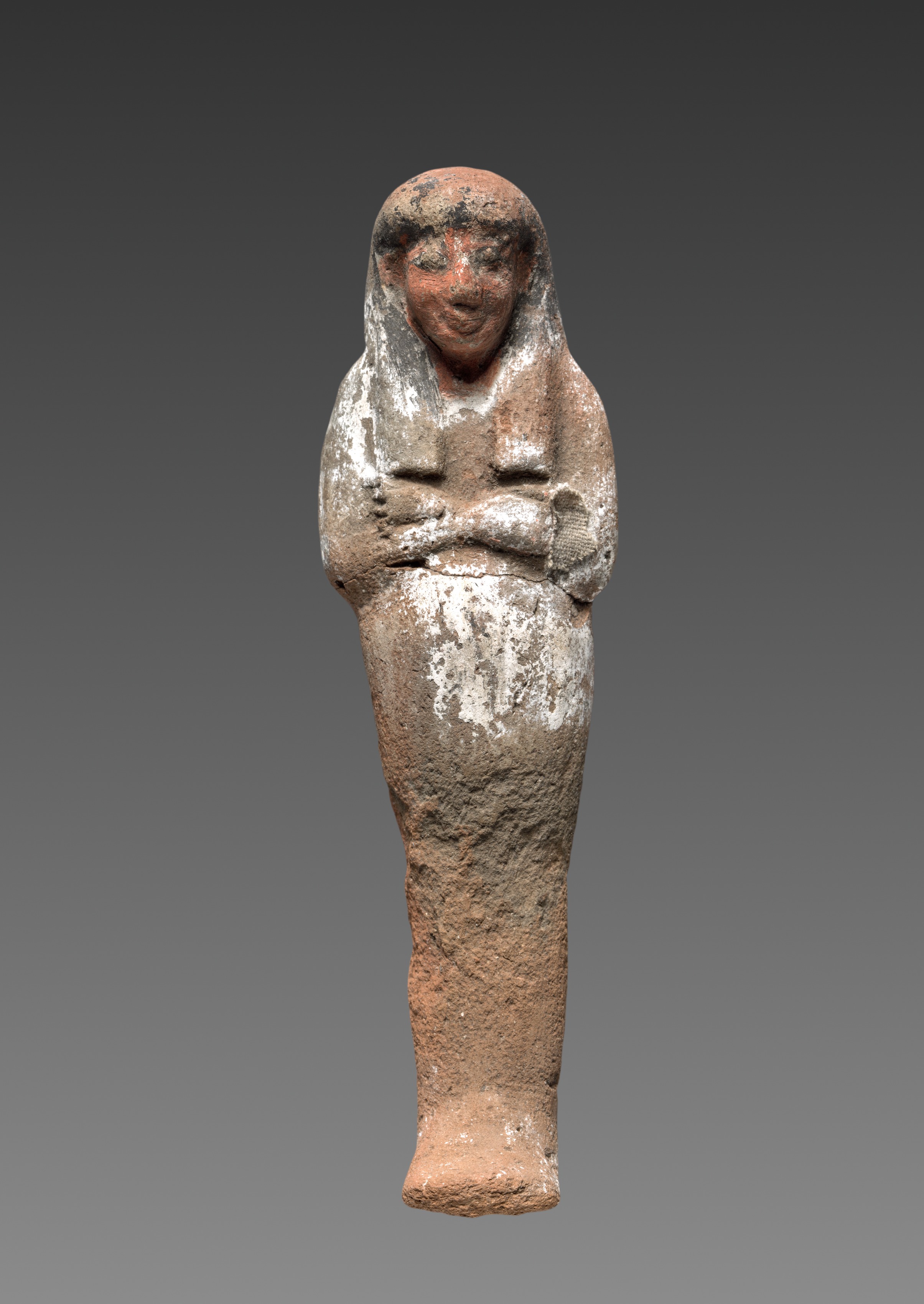 The Shawabty, by an unknown artist, is a small terracotta figurine of a mummified person with a head and shoulders protruding from a long, wrapped body. The figure has a long, thin face with a nose, mouth, and eyes. The eyes and eyebrows are painted black. The body is wrapped in a white cloth with some brown and black patches. The figure's arms are crossed over its chest. The statue has a rough texture and appears to be weathered, with some white patches on the surface. The background is a gradient from dark gray to light gray.