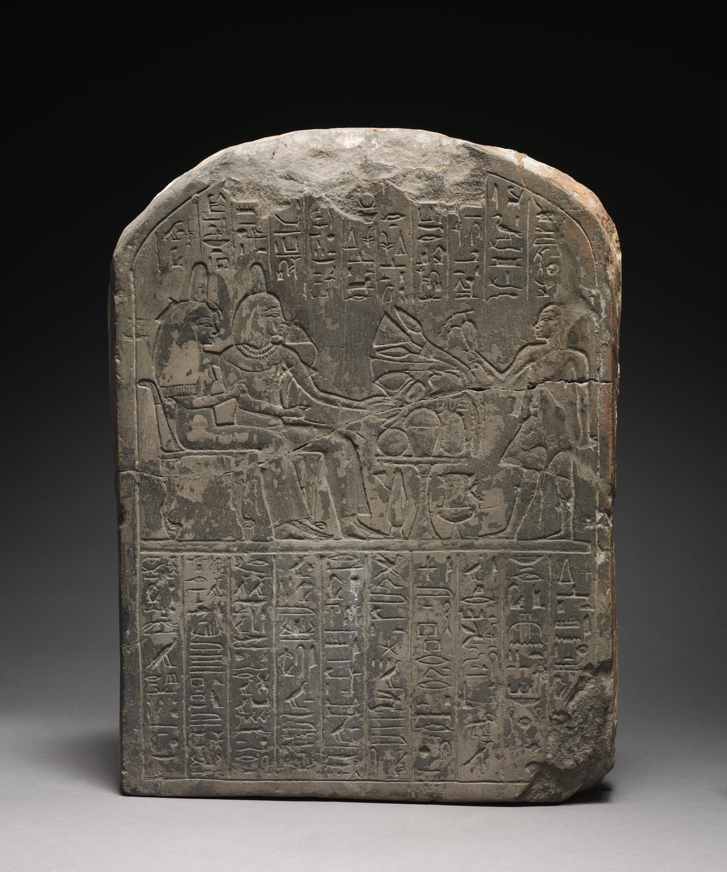 The Stele of Userhat depicts a rectangular stone slab with a rounded top. The stone is dark gray and has a rough texture. The top section features two figures seated on either side of a table with offerings, facing each other. The figure on the left is larger and sits in a chair with a high back. The figure on the right is smaller and sits on a low stool. Both figures wear traditional ancient Egyptian clothing and have their arms raised in a gesture of worship or offering. The table between them holds various objects. The bottom section contains several rows of hieroglyphics that cover most of the surface. The background of the image is black, with a gradient that lightens towards the bottom. The stone slab casts a slight shadow on the surface below it. The overall appearance suggests an ancient artifact, likely from Egypt.