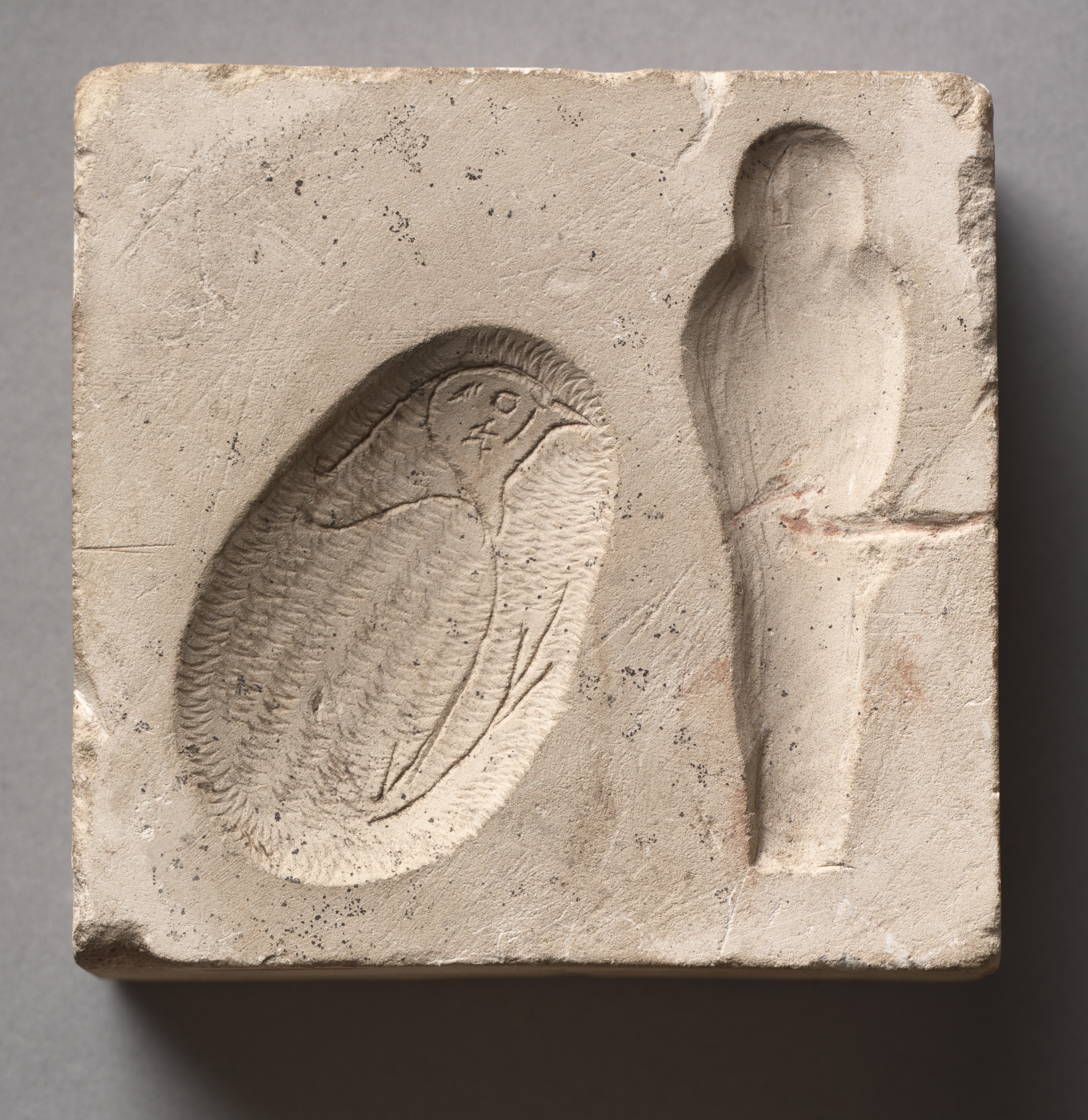 Beige square stone block with rough edges and surface. Left side of block features a carved oval shape with a bird design. The bird has detailed feathers and facial features. Right side of block features a carved shape resembling a vase or container with a narrow base and wider top. The vase shape has a rounded top. The background of the image is grey. The square stone block is titled "Mold in Two Parts" by an unidentified artist.