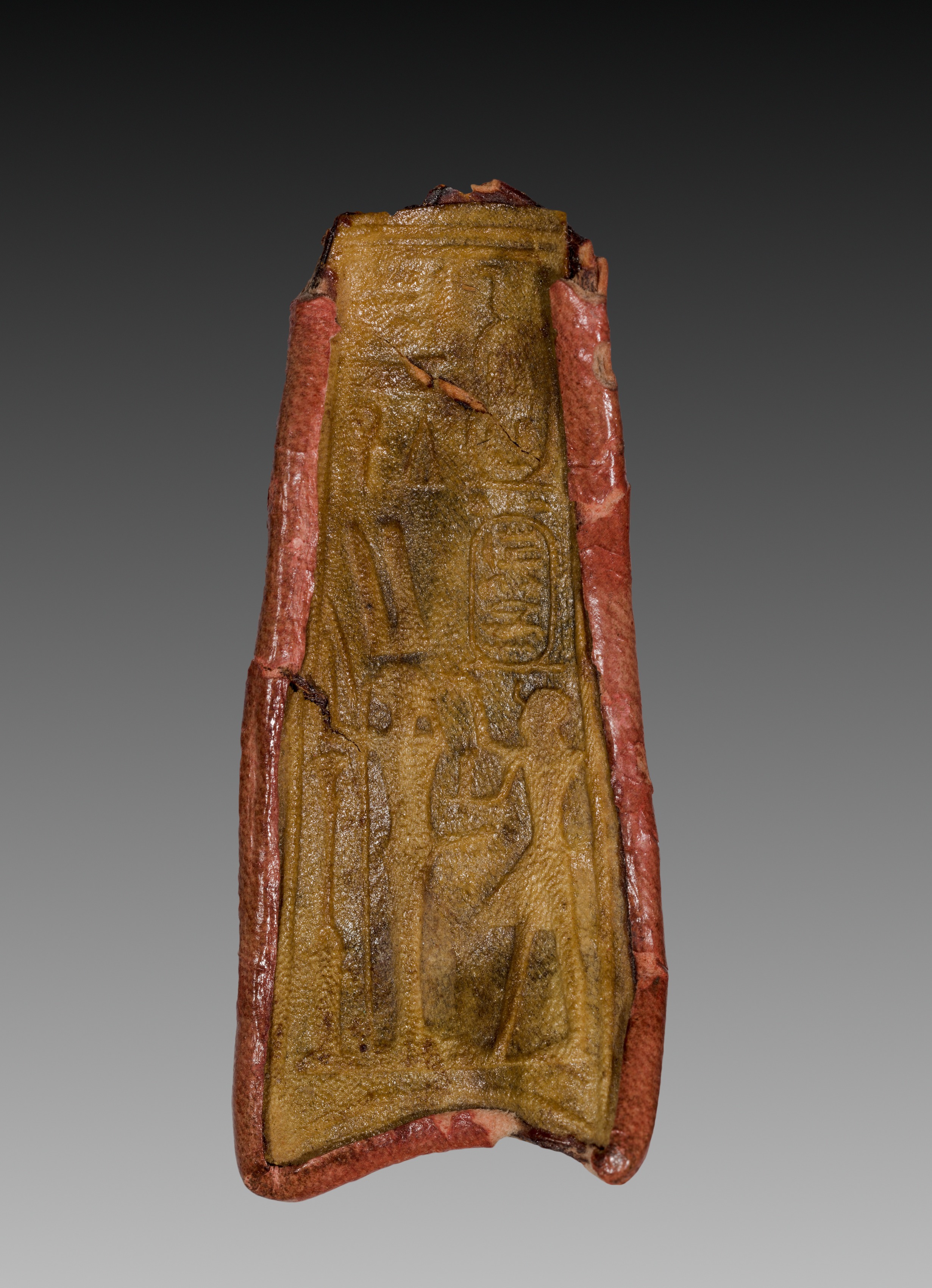 Brown and red mummy band with a relief image of a standing figure. The band is long and narrow, tapering slightly at the bottom. The band has a brown relief image on a lighter brown background. The relief depicts a figure with a large head and small body. The figure has a distinctive face with lines on the forehead. The figure wears a headdress on top of its head. The figure's arms are bent at the elbows, with the right hand near the chest and the left hand lower. The band has a red border on either side, with rough edges. The band appears to be made of a rough, textured material, possibly leather or clay. The background of the image is a gradient from dark gray at the top to light gray at the bottom. The band by Mummy Band.