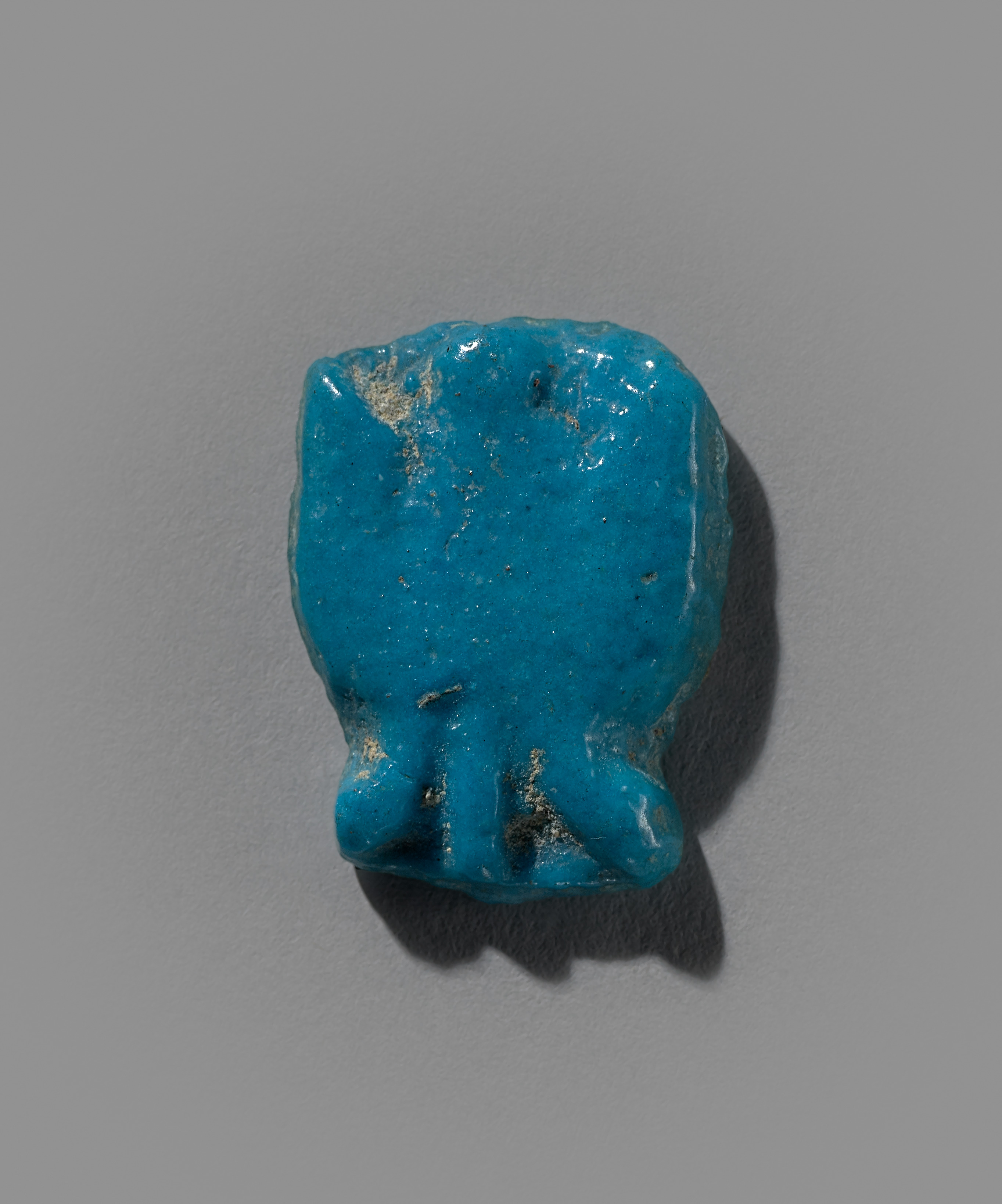 Food Model Amulet: Brace of Duck by Unknown. The image shows a small, blue, stone amulet in the shape of a brace of duck. The amulet is irregularly shaped and has a glossy finish. It is a bright blue color with some darker speckles and patches of gold. The duck's head and legs are visible, with the head at the top and the legs at the bottom. The background is a plain gray color, with a shadow cast by the amulet.