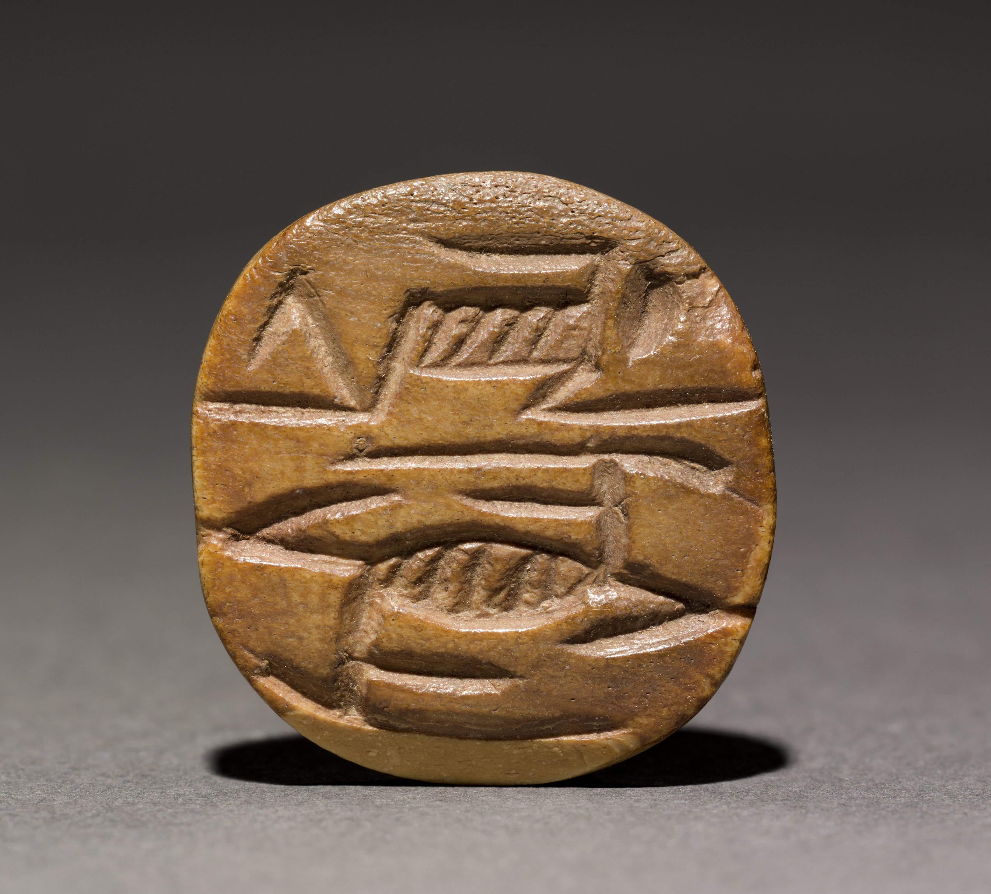 The Seal Amulet by Limestone Seal Amulet is an oval-shaped object made of brown stone. The object is carved with several lines and shapes, including two symmetrical designs that resemble eyes or shells. The top and bottom of the object have horizontal lines, while the middle section features a series of carved lines and shapes. The background of the image is dark gray, with a lighter gray surface that the object is sitting on. A shadow is cast underneath the object. The object appears to be an ancient seal or amulet, possibly used for decorative or symbolic purposes.