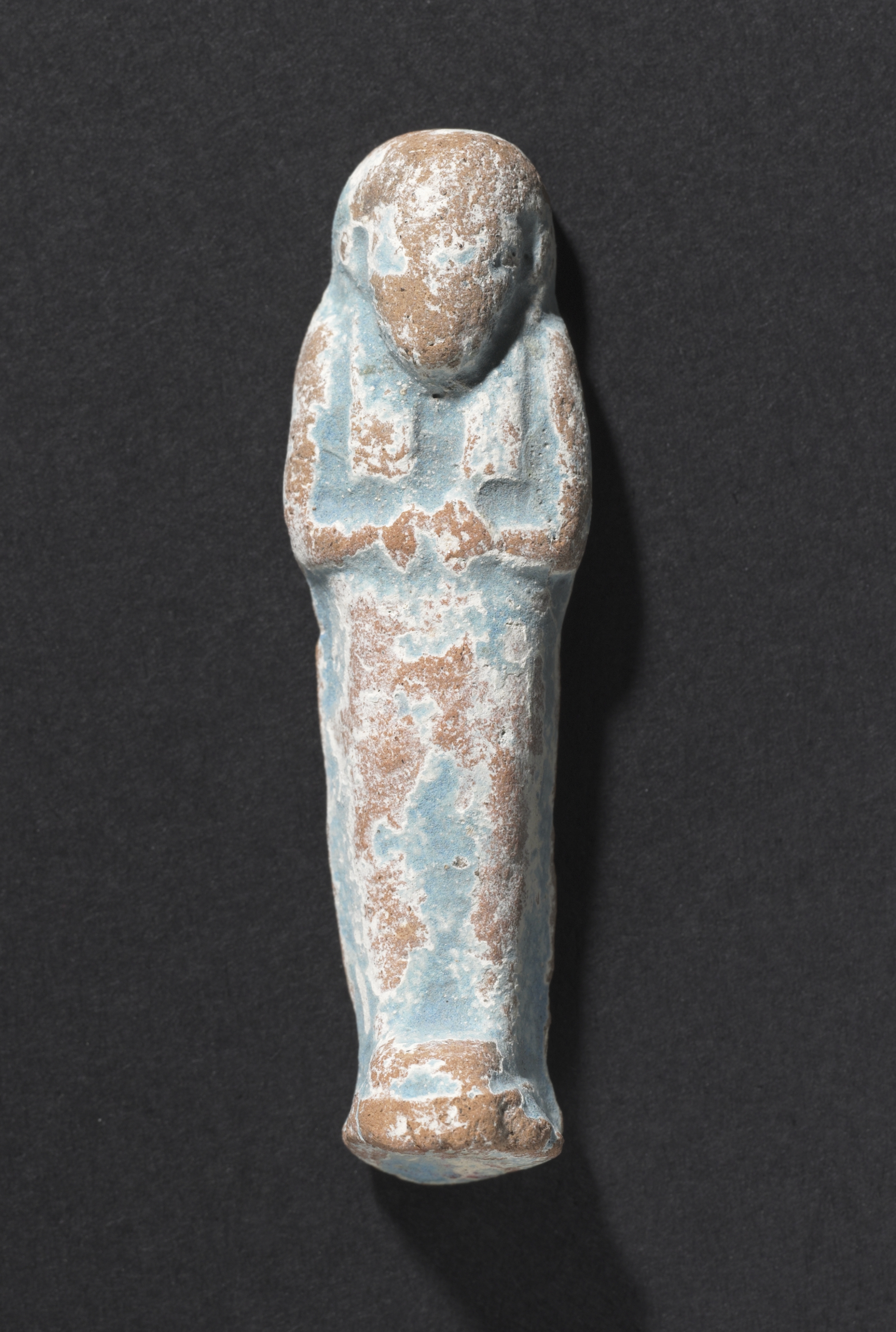Shawabty of Ditamenpaankh: a small, worn, blue-glazed ceramic or faience figurine of a mummified person with a rounded head, arms crossed over the chest, and a long, narrow body, with visible brown clay beneath the peeling blue glaze, against a dark grey background.