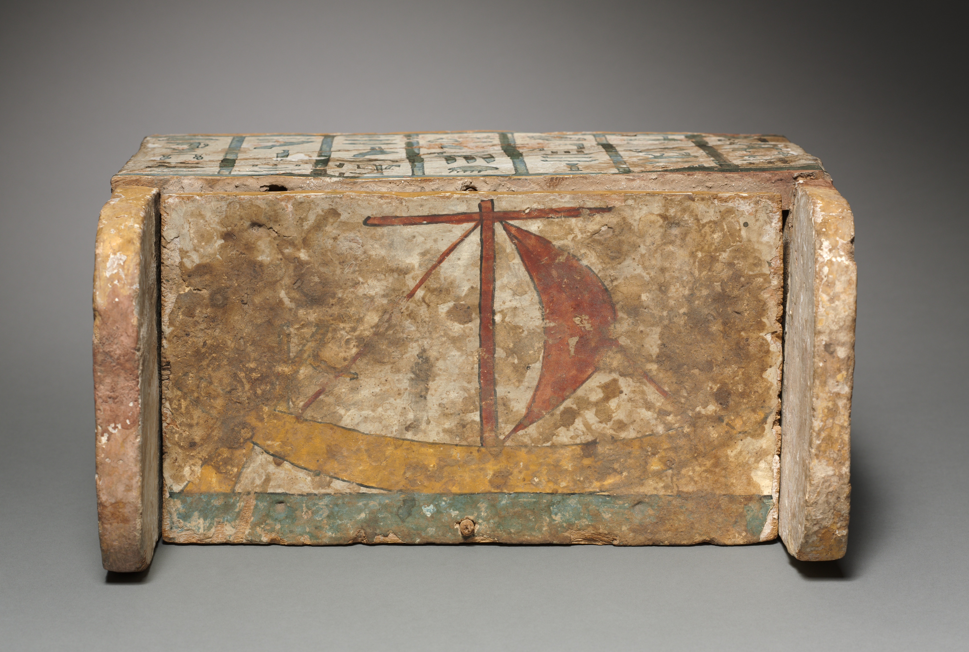 The image shows the cover of a rectangular box, likely made of wood. The box's cover features a faded painting with a dominant red sailboat on a yellow base against a teal-colored waterline on the bottom. Above the sailboat painting, the box's surface appears worn and tan with darker spots; similar discoloration is on the sides. The cover's top surface is flat and displays a grid-like design with green lines and rectangles. The box's front edges are rounded.