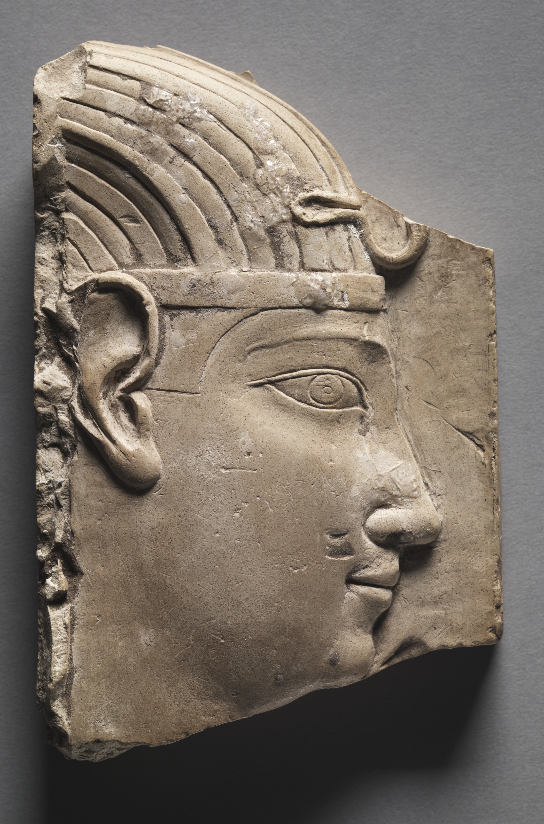 The Votive Relief of a King by an unknown artist depicts a stone carving of a man's face in profile, facing right. The face has a prominent ear, nose, and eye, with the eye having a circular pupil. A horizontal line across the forehead represents a headband or crown. The carving appears to be made of a light-colored stone and is broken off on the left side and bottom. The top of the head is curved and features lines radiating from it, resembling hair or a headdress. The background of the image is a plain gray color.