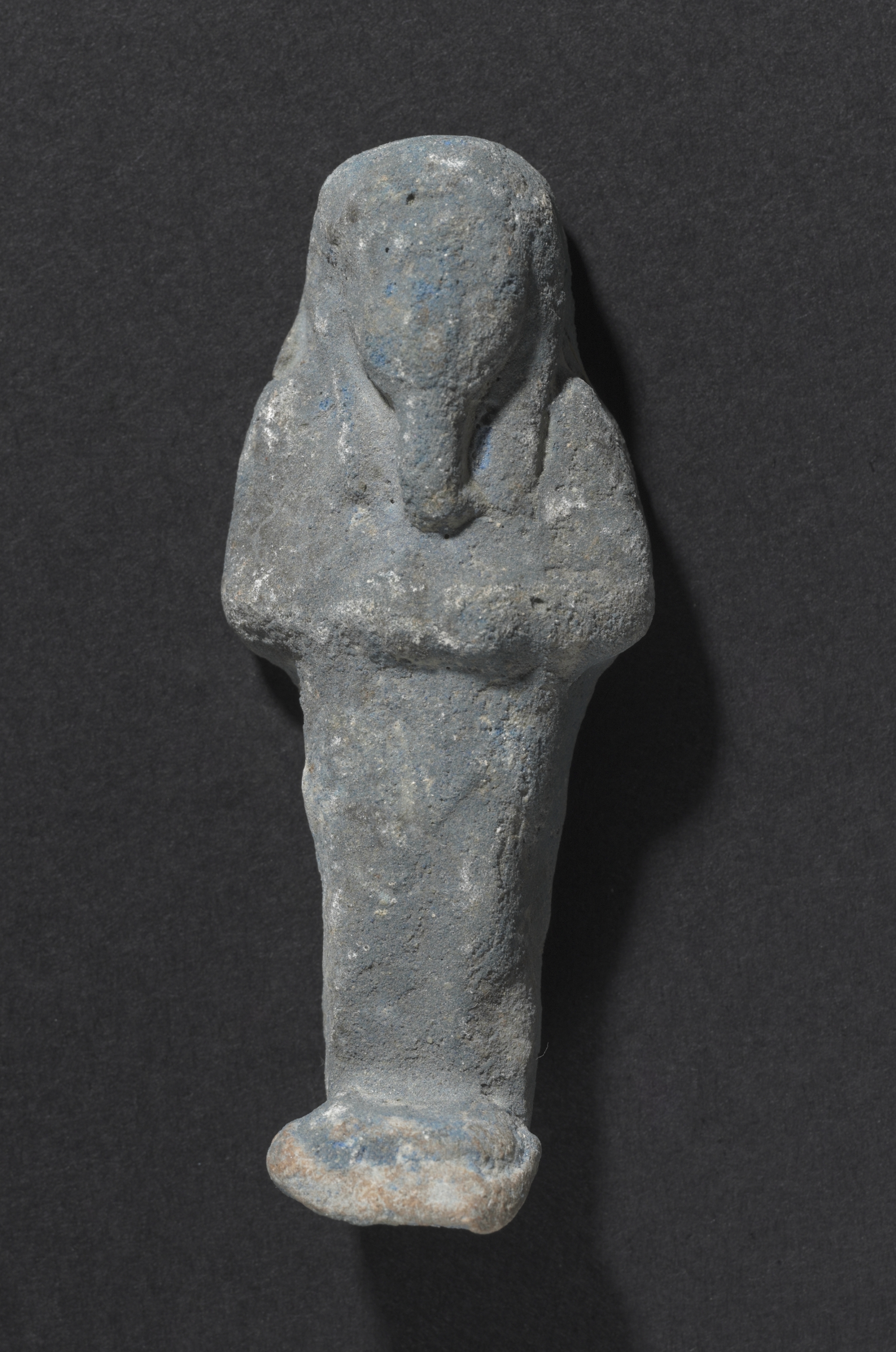 The Shawabty of Ditamenpaankh is a small, grayish-blue figurine with a rough texture. The figurine depicts a standing person with a rounded head, a long face and a protruding nose. The arms are crossed over the chest. The body is rectangular and elongated. The legs are fused together. The feet are visible at the bottom. The background is dark gray.