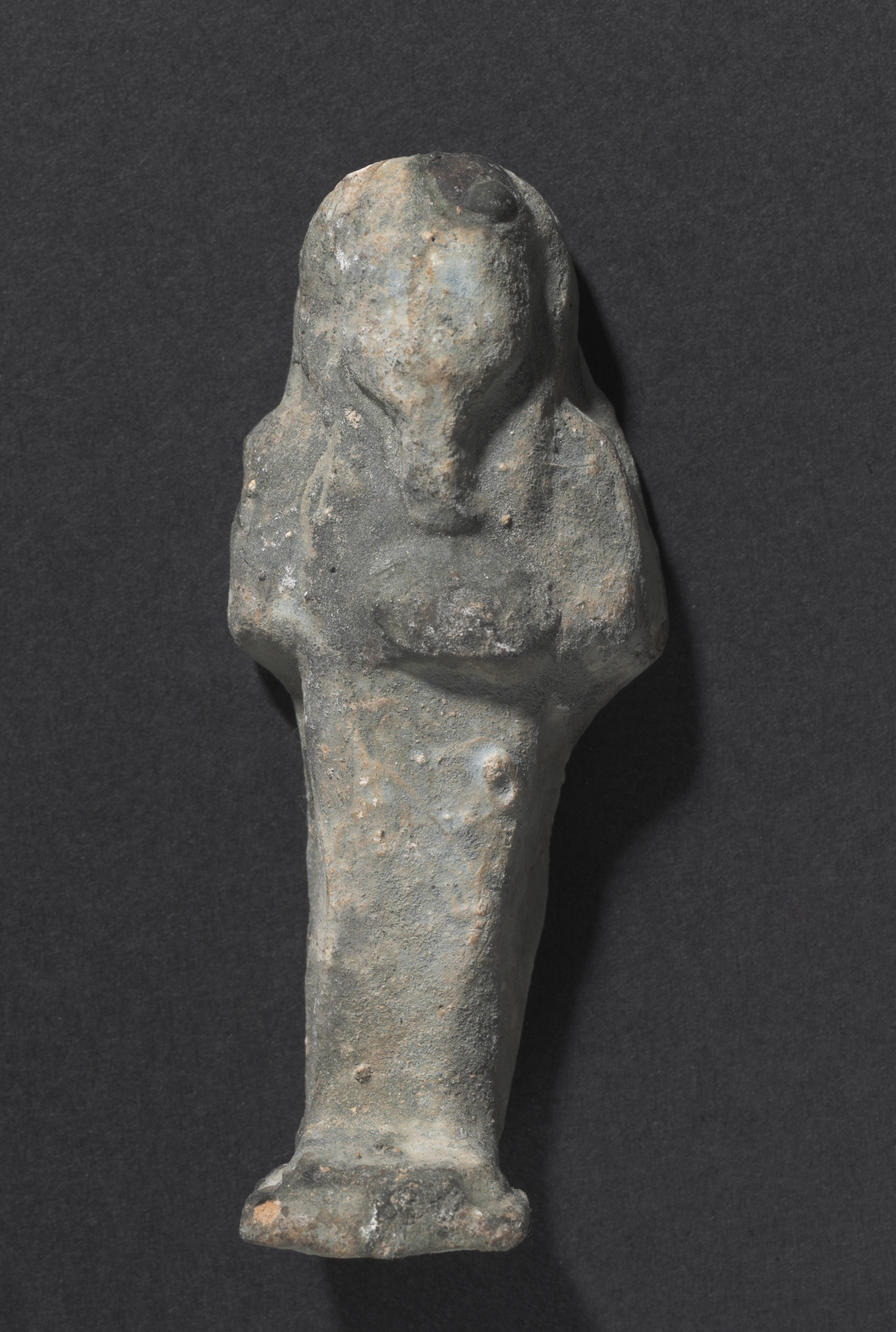 The Shawabty of Ditamenpaankh is a small, grayish-colored figurine with a rough texture. The figurine depicts a standing person with a rounded head, a face featuring a nose, mouth, and eyes, and a body with the arms crossed over the chest. The figure has a long, narrow body with a slightly wider top and a flat base. The surface of the figurine shows signs of wear and aging, with visible spots and discoloration. The background of the image is dark gray.