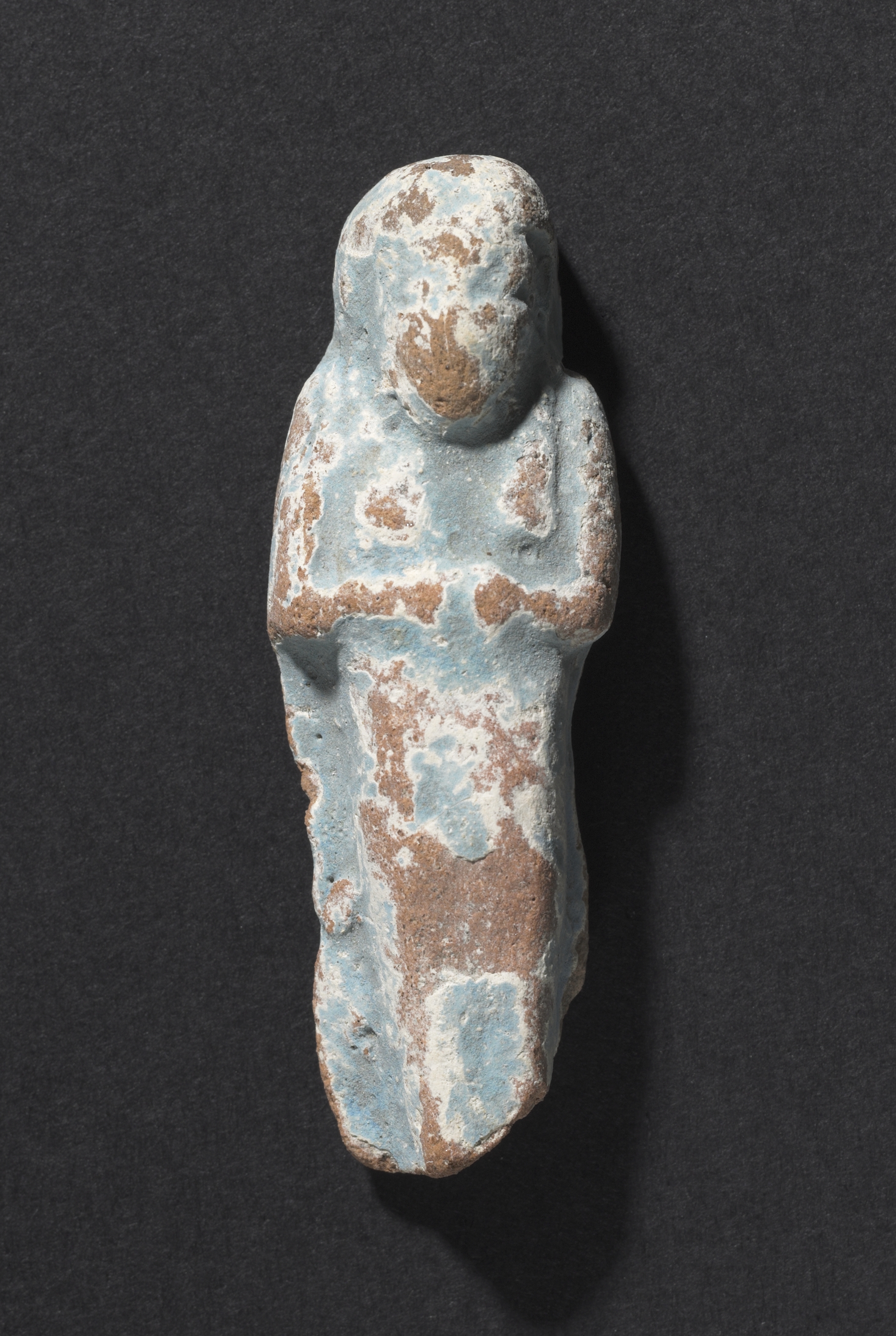 The Shawabty of Ditamenpaankh is a figurine of a mummified person. It is mostly blue with areas of brown showing through where the blue is chipped and worn. The figure has a rounded head, with no discernible facial features. The body is elongated with the arms crossed over the chest. The legs are fused together. The object has a rough texture and appears to be made of ceramic or stone. The background is dark gray.