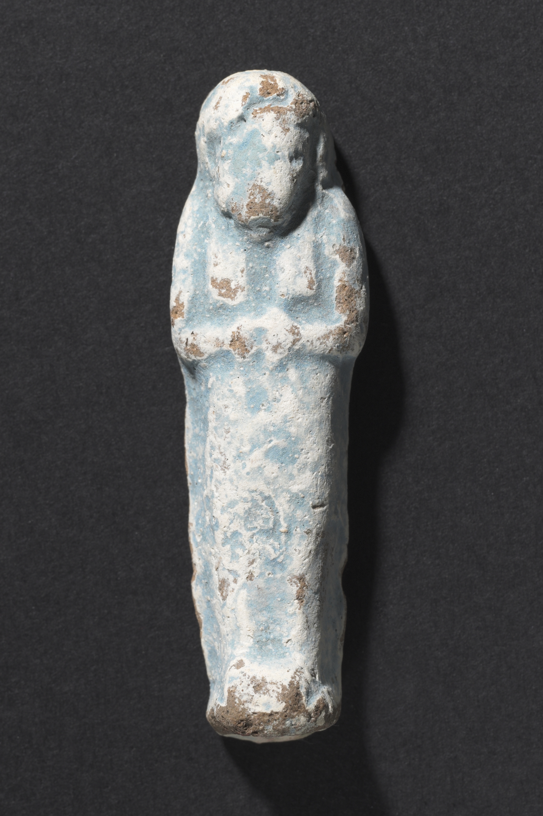 The Shawabty of Ditamenpaankh is a small, light blue figurine with white and brown patches. The figurine is standing upright with its arms crossed over its chest. The head is rounded, and the face is not detailed. The body is elongated and narrow, with a rough texture. The figurine appears to be made of a material that has chipped and worn away in places, revealing brown underneath. The background is dark gray.