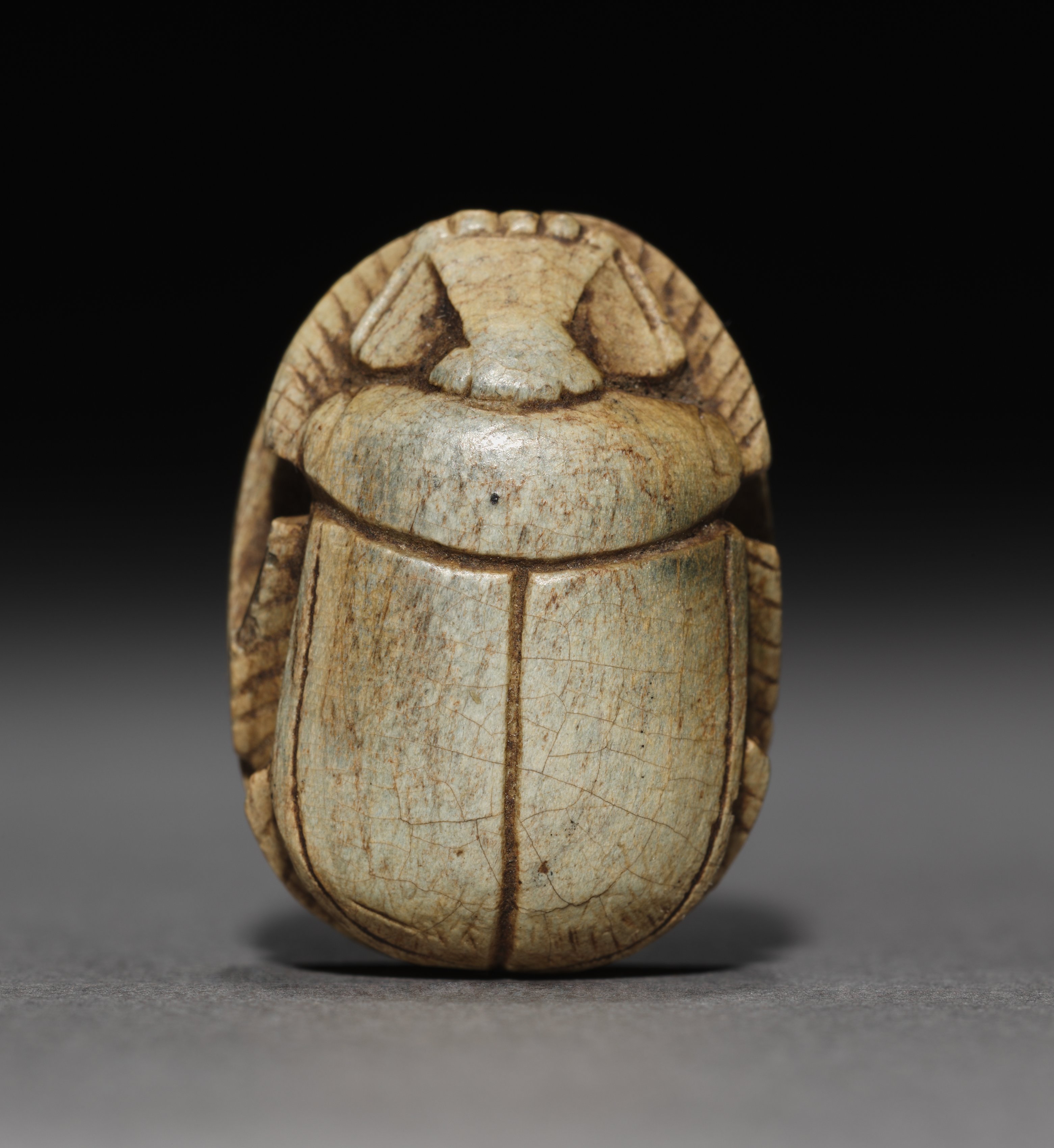 Light brown and beige stone scarab with a rounded body, divided into sections by engraved lines. The top section features a smaller rounded dome with a short, thick protrusion. The scarab has a flat base. The background fades from black to gray. The image is titled 'Scarab'.