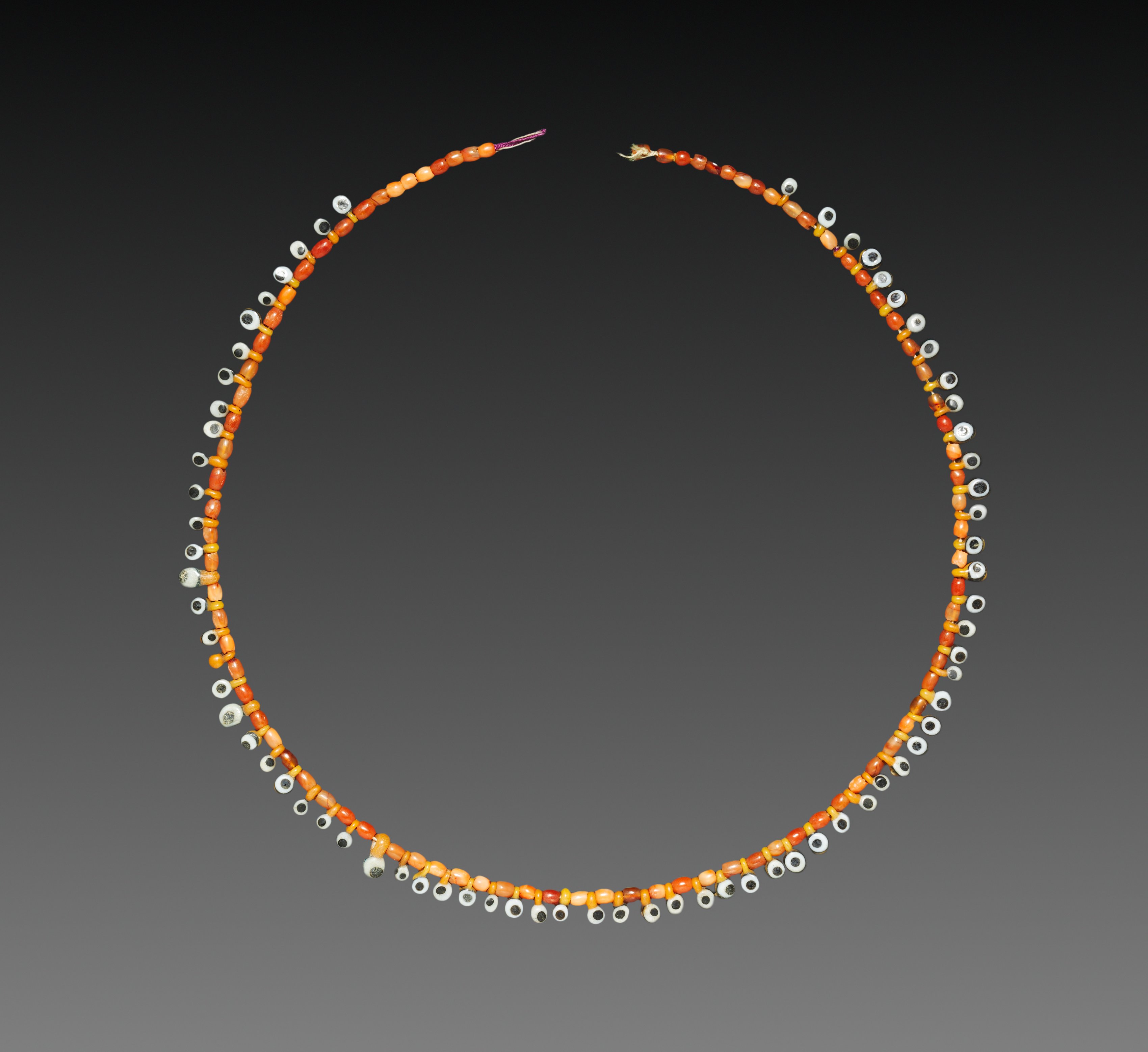 Necklace by Barry Kanaiaupuni: A necklace made of numerous small orange and yellow seed beads with white and black eye beads interspersed throughout; two metal prongs extend from one end.